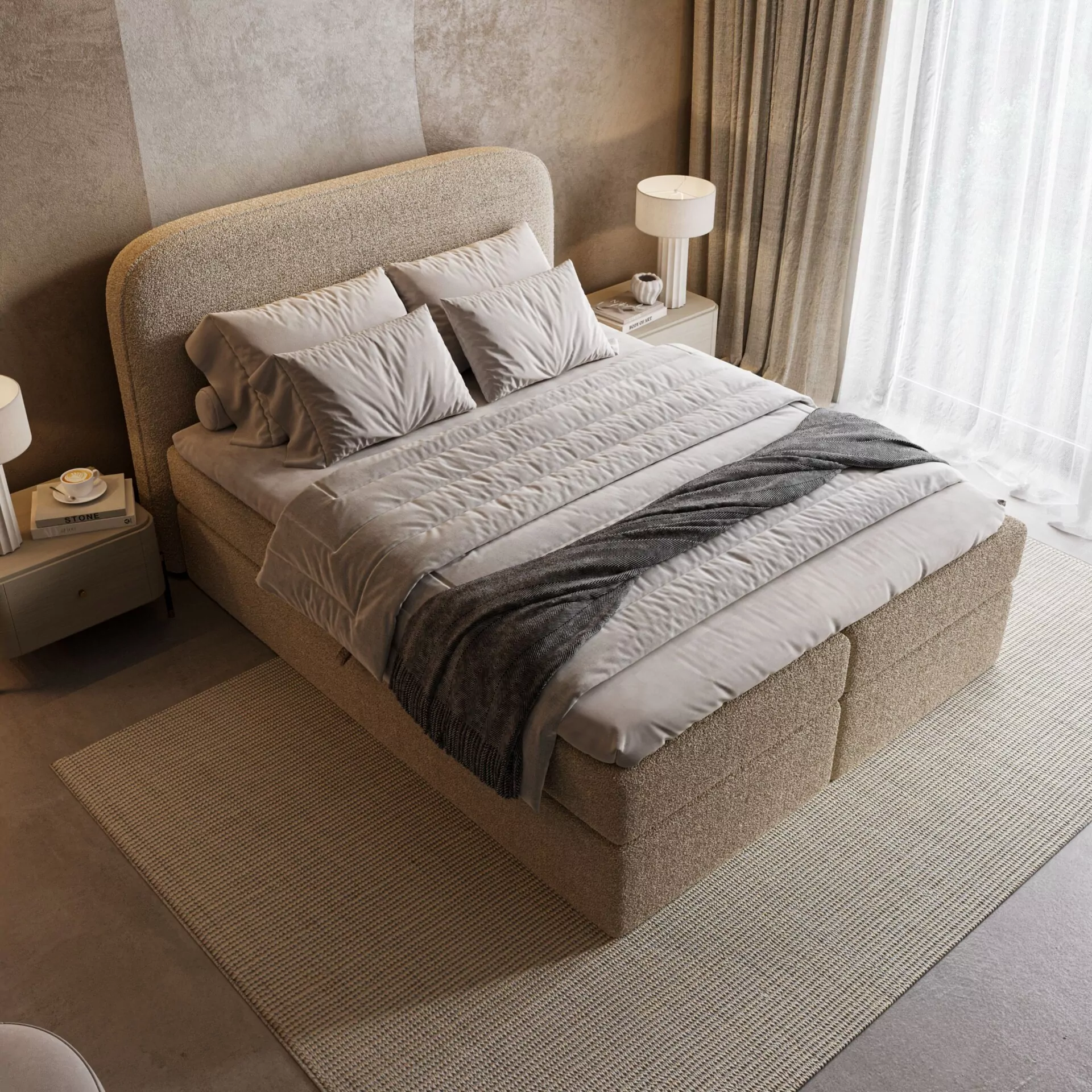 Łóżko Dreamo w tkaninie Quelle 6 to połączenie nowoczesnego stylu, przytulności oraz wysokiej funkcjonalności. Charakterystyczna struktura materiału typu boucle nadaje mu miękkości i eleganckiego wyglądu, a zaokrąglony zagłówek podkreśla jego designerski charakter. Jasny, beżowy odcień doskonale wpisuje się w modne aranżacje wnętrz – od minimalistycznych, przez japandi, aż po nowoczesne i eleganckie sypialnie.