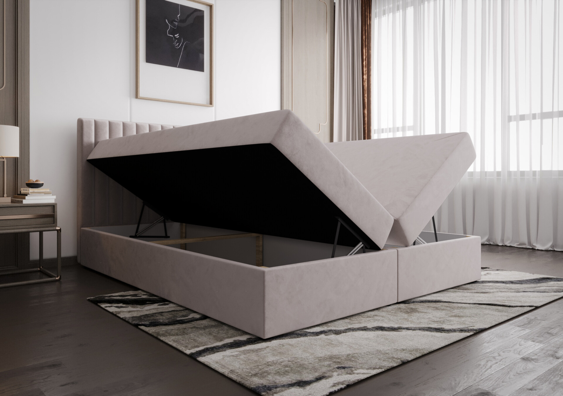 Łóżko posiada dwa pojemne schowki na pościel, do których dostęp ułatwia automat sprężynowy. To wygodne i estetyczne miejsce na przechowywanie tekstyliów, kołder czy sezonowych ubrań.