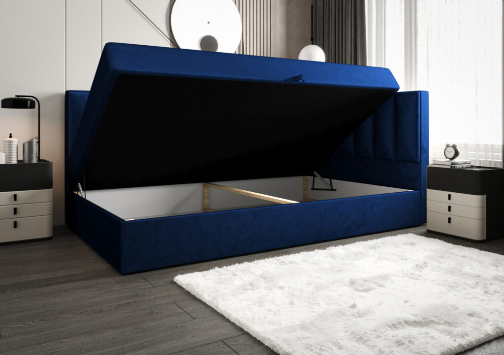 Nowoczesne, narożne wezgłowie w formie pionowych paneli nadaje wnętrzu charakteru, a tapicerowana konstrukcja w wybranej tkaninie wprowadza przytulność i elegancję. Wbudowany pojemnik na pościel to praktyczne rozwiązanie, które ułatwia codzienną organizację.