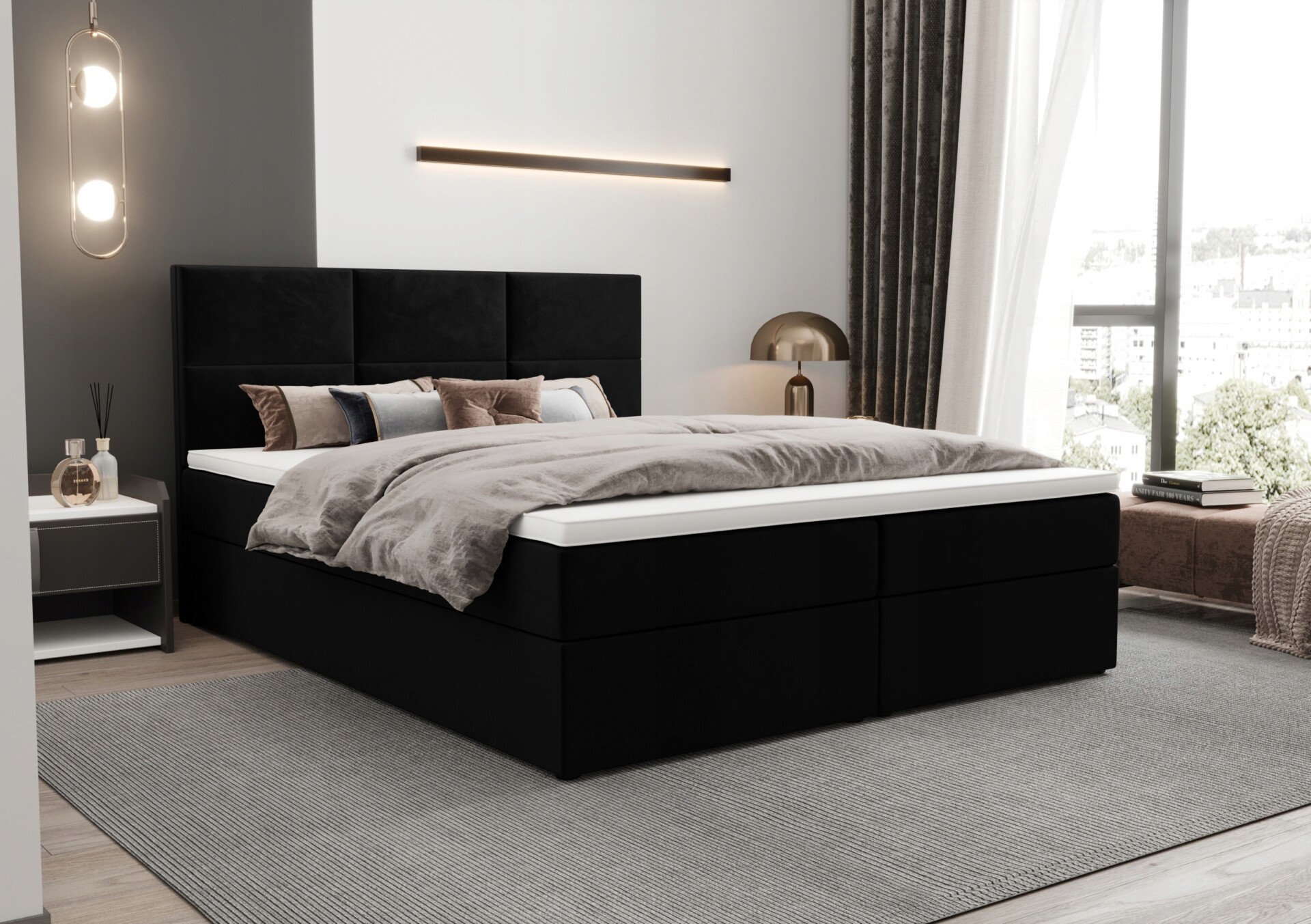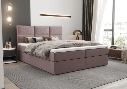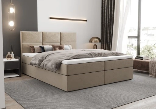 Eleganckie łóżko w tkaninie Velutto 2 wyróżnia się nowoczesnym zagłówkiem z geometrycznymi przeszyciami, który nadaje wnętrzu stylowego charakteru. Miękka, welurowa tkanina w beżowym odcieniu wprowadza przytulność i elegancję. Rozmiar 160×220 cm zapewnia komfortową przestrzeń snu dla dwóch osób. Materac H3 z pianki T-25 oraz topper w zestawie gwarantują wygodny wypoczynek każdej nocy. Dwa pojemniki na pościel zwiększają funkcjonalność i ułatwiają przechowywanie.