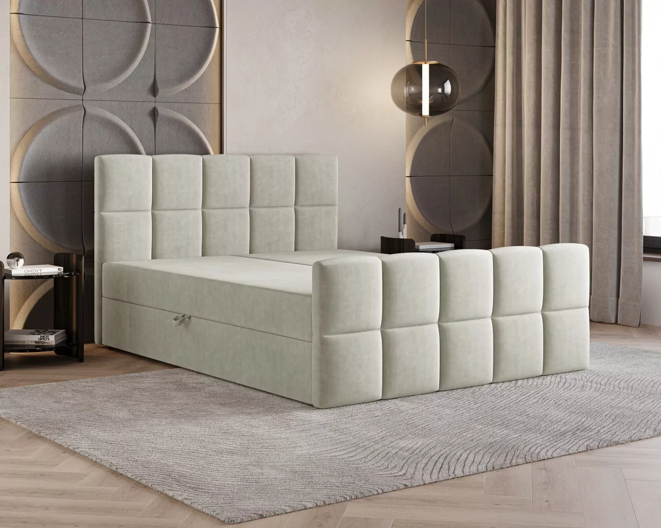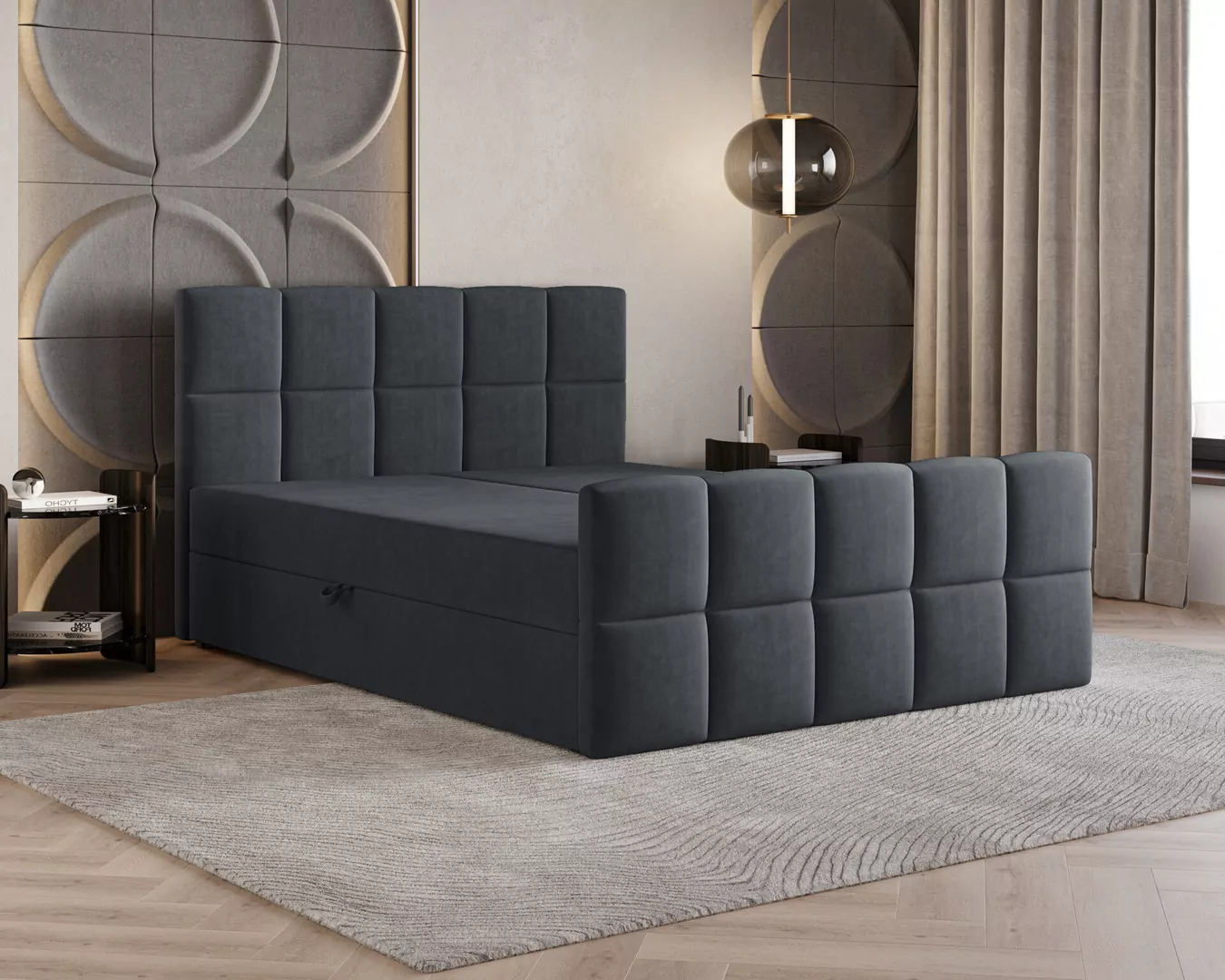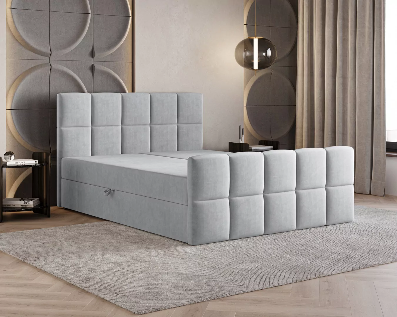 Łóżko kontynentalne MONACO to połączenie nowoczesnego designu, funkcjonalności i wyjątkowego komfortu snu. Charakterystyczne, geometryczne przeszycia nadają mu elegancki i prestiżowy wygląd, dzięki czemu stanie się centralnym punktem każdej sypialni. Tapicerka wykonana z przyjemnej w dotyku tkaniny Velutto 1 podkreśla jego luksusowy charakter i wprowadza do wnętrza przytulną atmosferę.