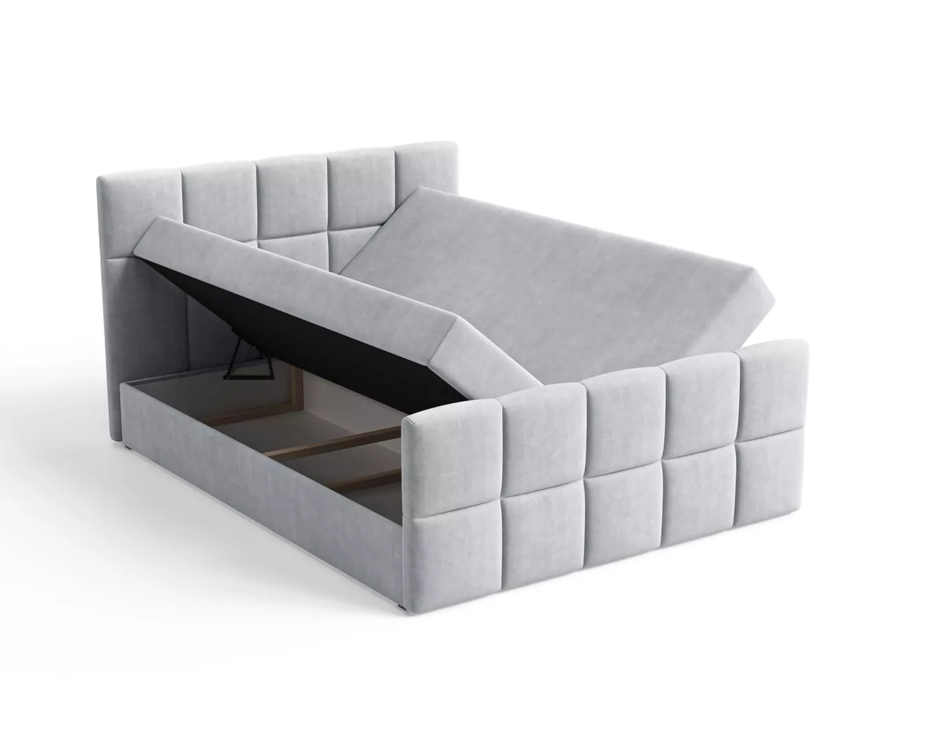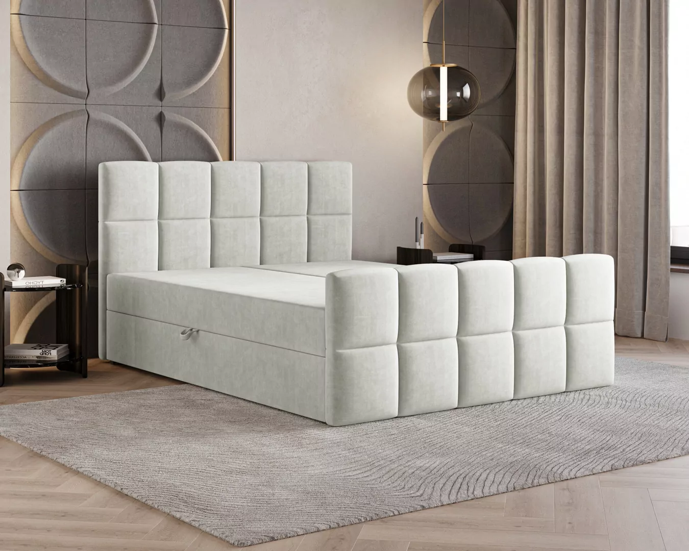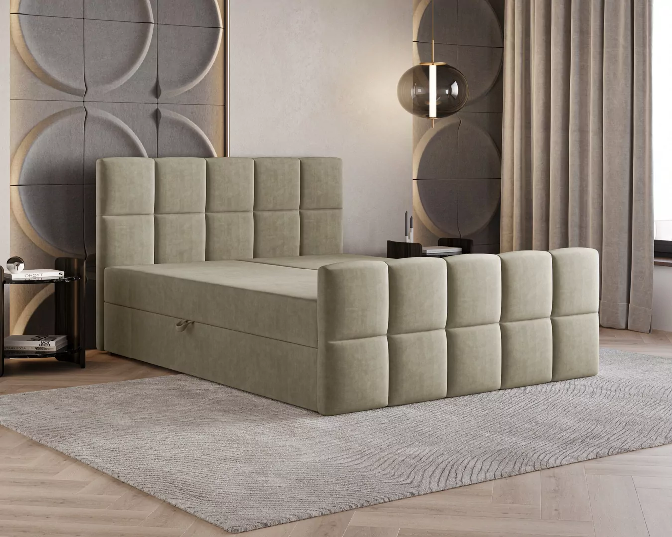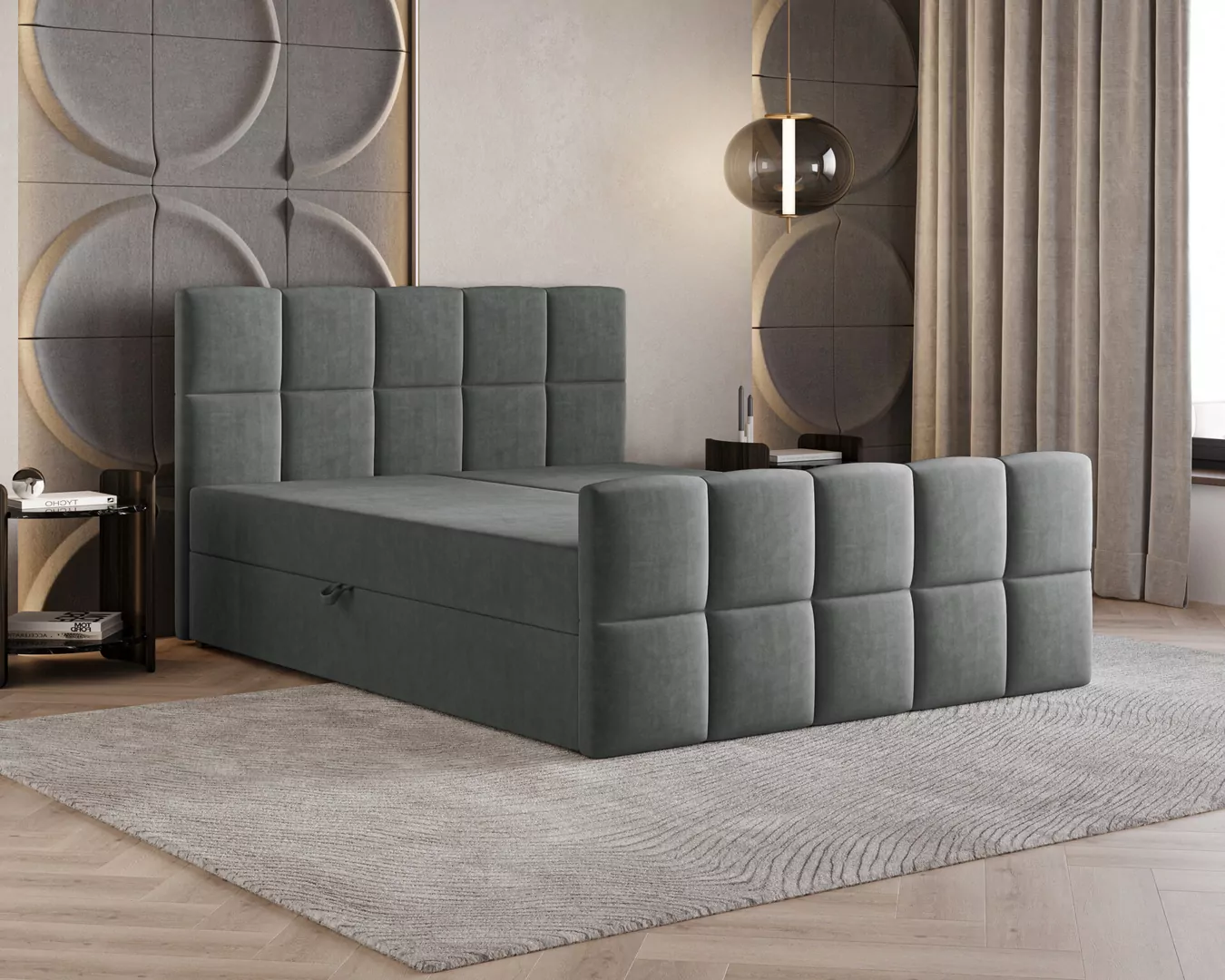 Łóżko kontynentalne MONACO to połączenie nowoczesnego designu, funkcjonalności i wyjątkowego komfortu snu. Charakterystyczne, geometryczne przeszycia nadają mu elegancki i prestiżowy wygląd, dzięki czemu stanie się centralnym punktem każdej sypialni. Tapicerka wykonana z przyjemnej w dotyku tkaniny Velutto 1 podkreśla jego luksusowy charakter i wprowadza do wnętrza przytulną atmosferę.