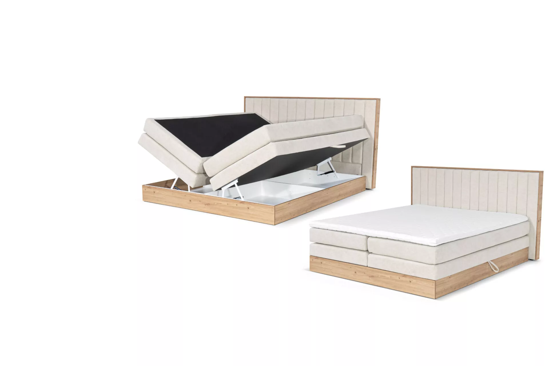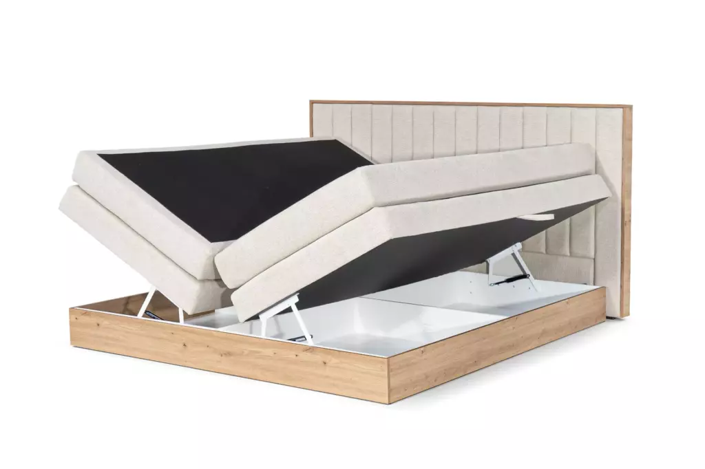 ✅ Funkcjonalny pojemnik – pod materacem znajdują się duże schowki, idealne do przechowywania pościeli, koców czy sezonowych tekstyliów. Mechanizm podnoszenia wspomagany siłownikami gazowymi sprawia, że dostęp do pojemnika jest lekki i bezproblemowy.