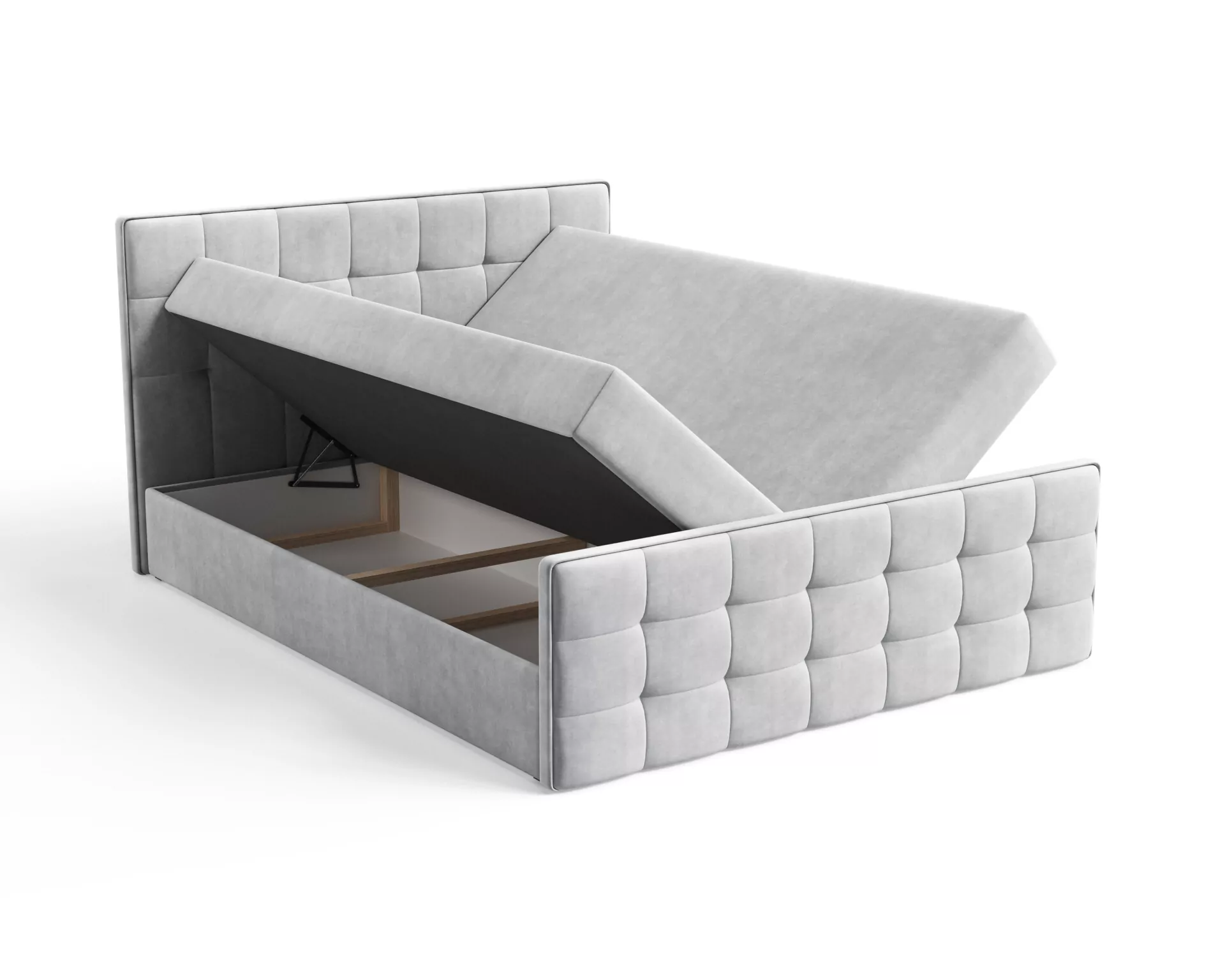 Pomimo luksusowej formy, Velia pozostaje niezwykle funkcjonalna. Pod częścią kontynentalną znajdują się dwa duże pojemniki na pościel, otwierane dzięki automatom sprężynowym, co gwarantuje wygodny, lekki dostęp. To idealne miejsce na kołdry, poduszki i sypialniane tekstylia.