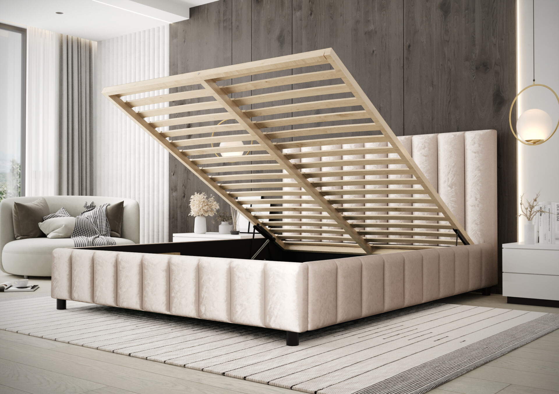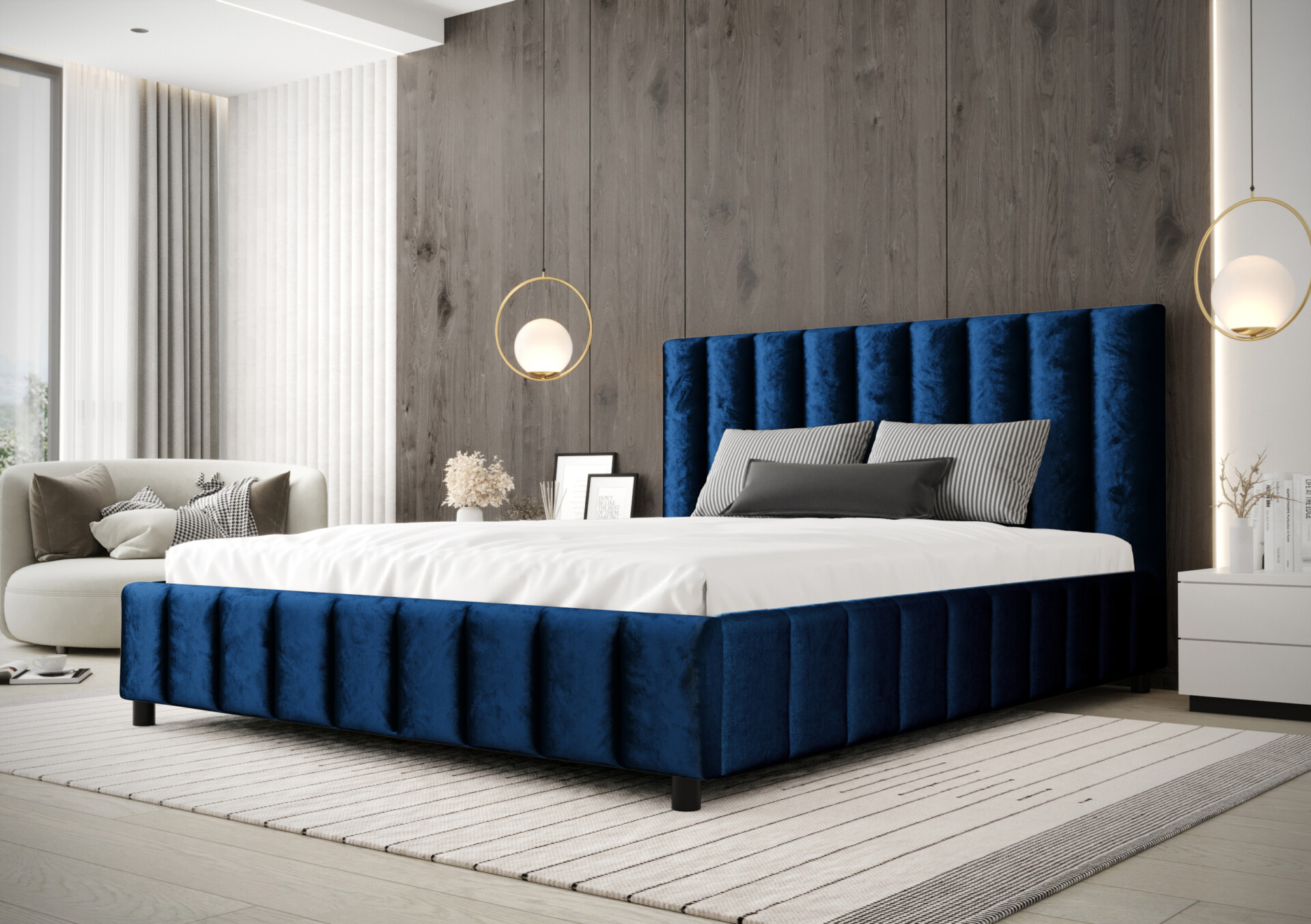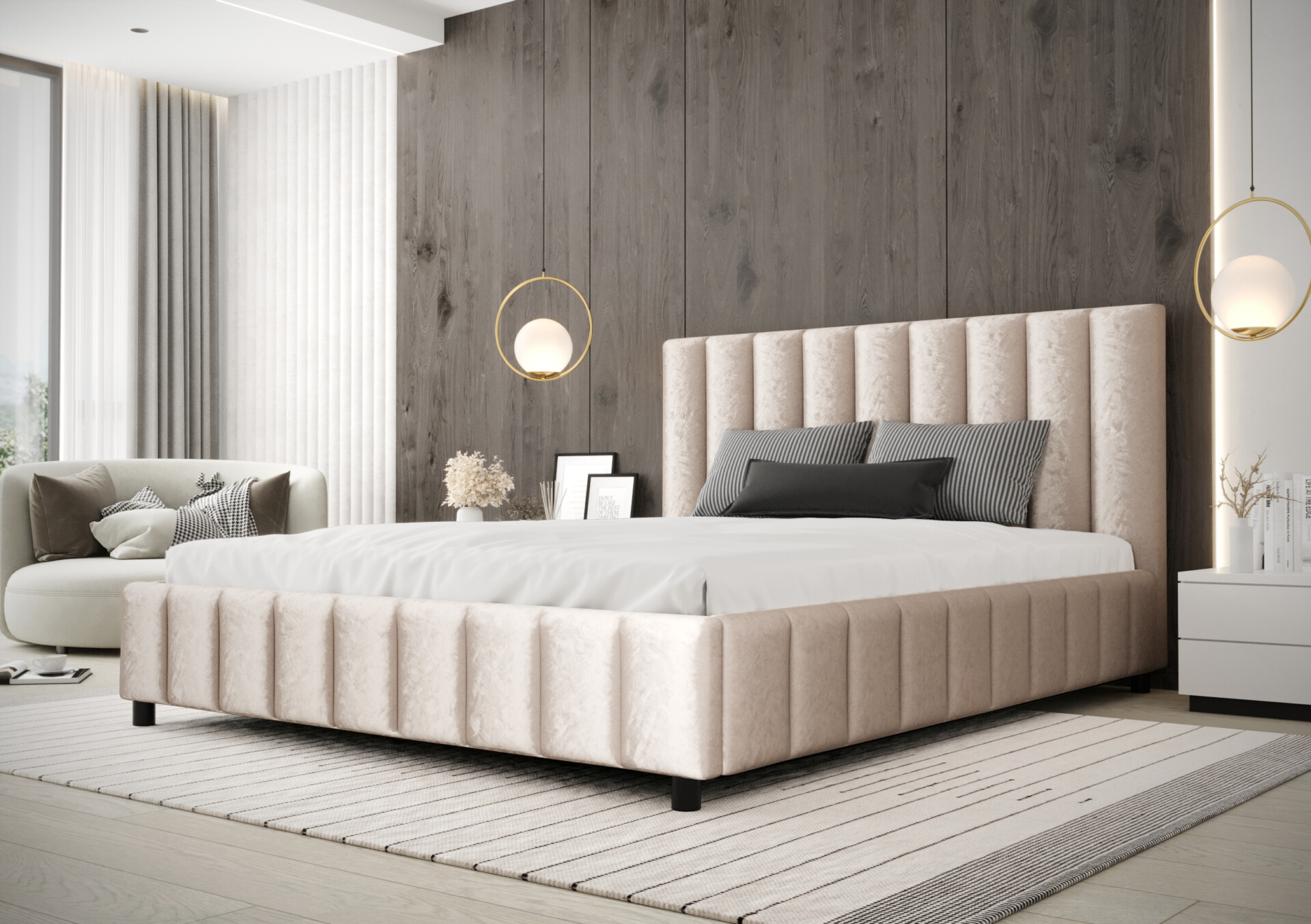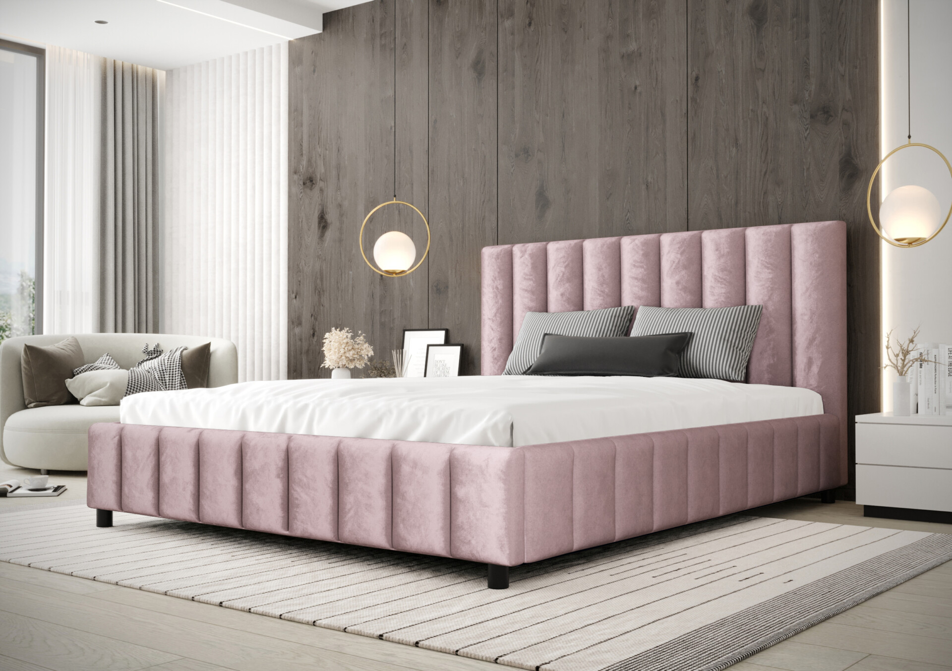 Łóżko Adelle zachwyca monumentalną, a zarazem subtelną formą. Wysoki zagłówek z dekoracyjnymi, pionowymi przeszyciami nadaje wnętrzu głębi i charakteru. Welurowa tkanina miękko odbija światło, tworząc atmosferę luksusu i przytulności.