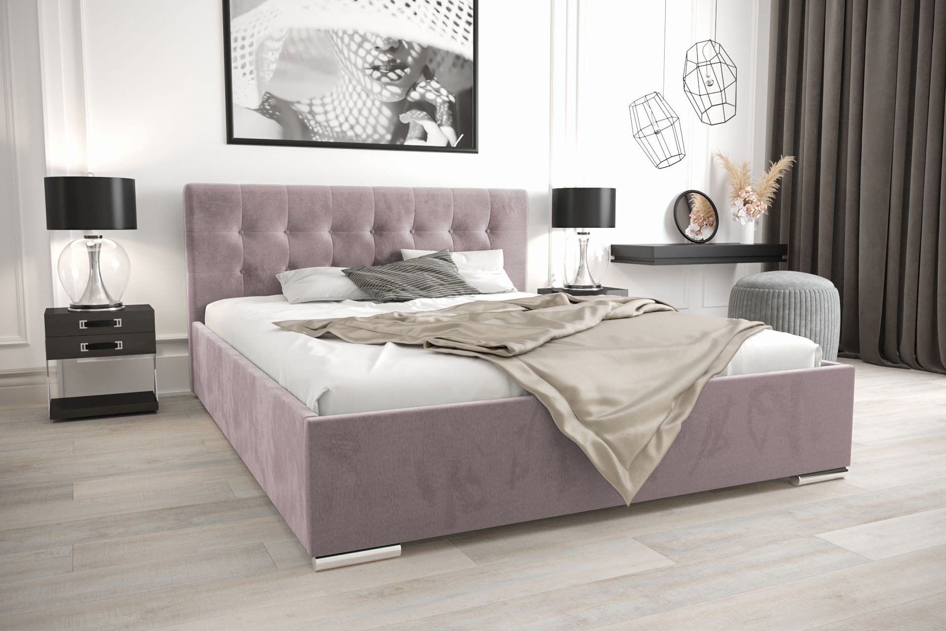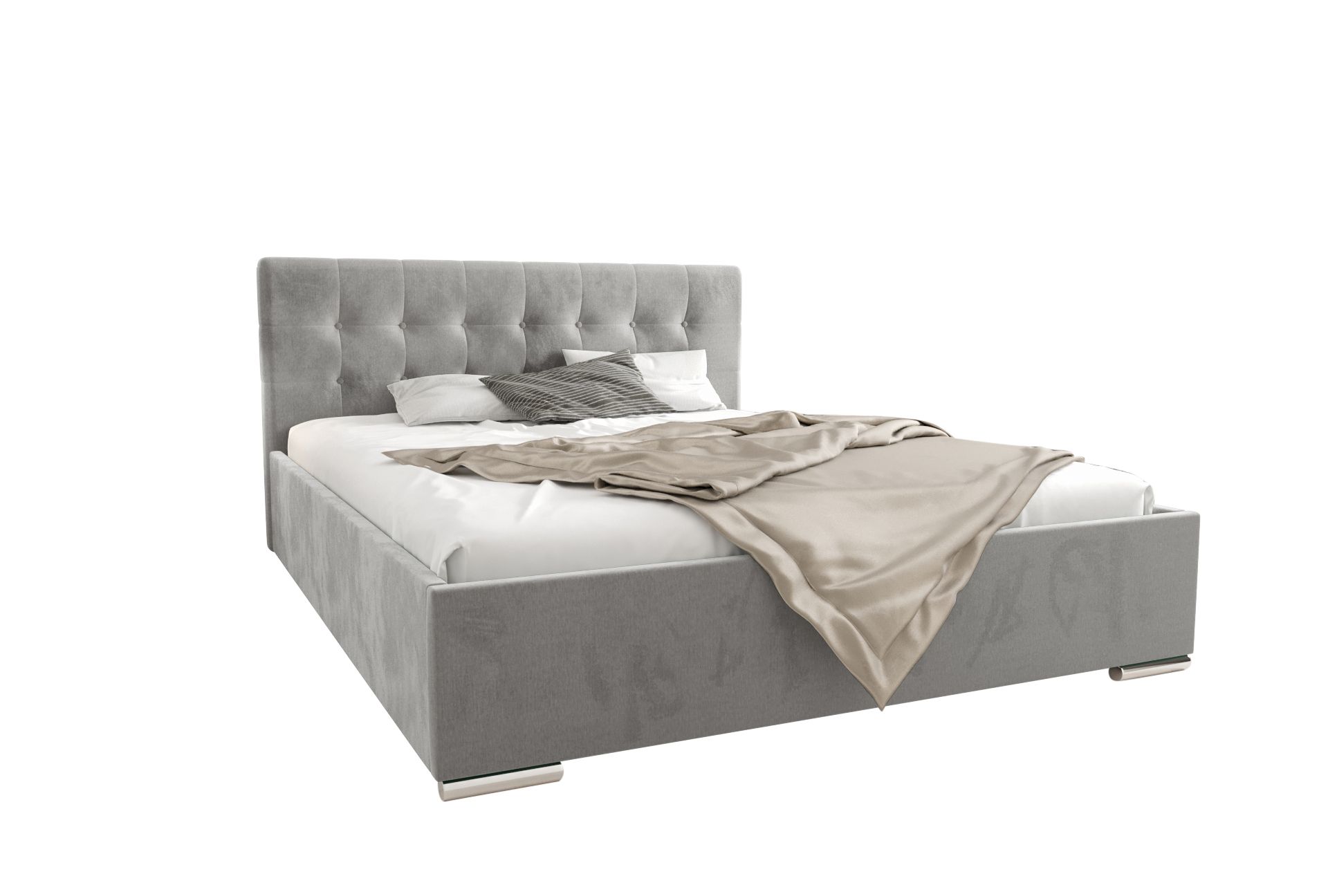 Nowoczesny wygląd podkreślają niskie, chromowane nóżki oraz minimalistyczna forma łóżka.