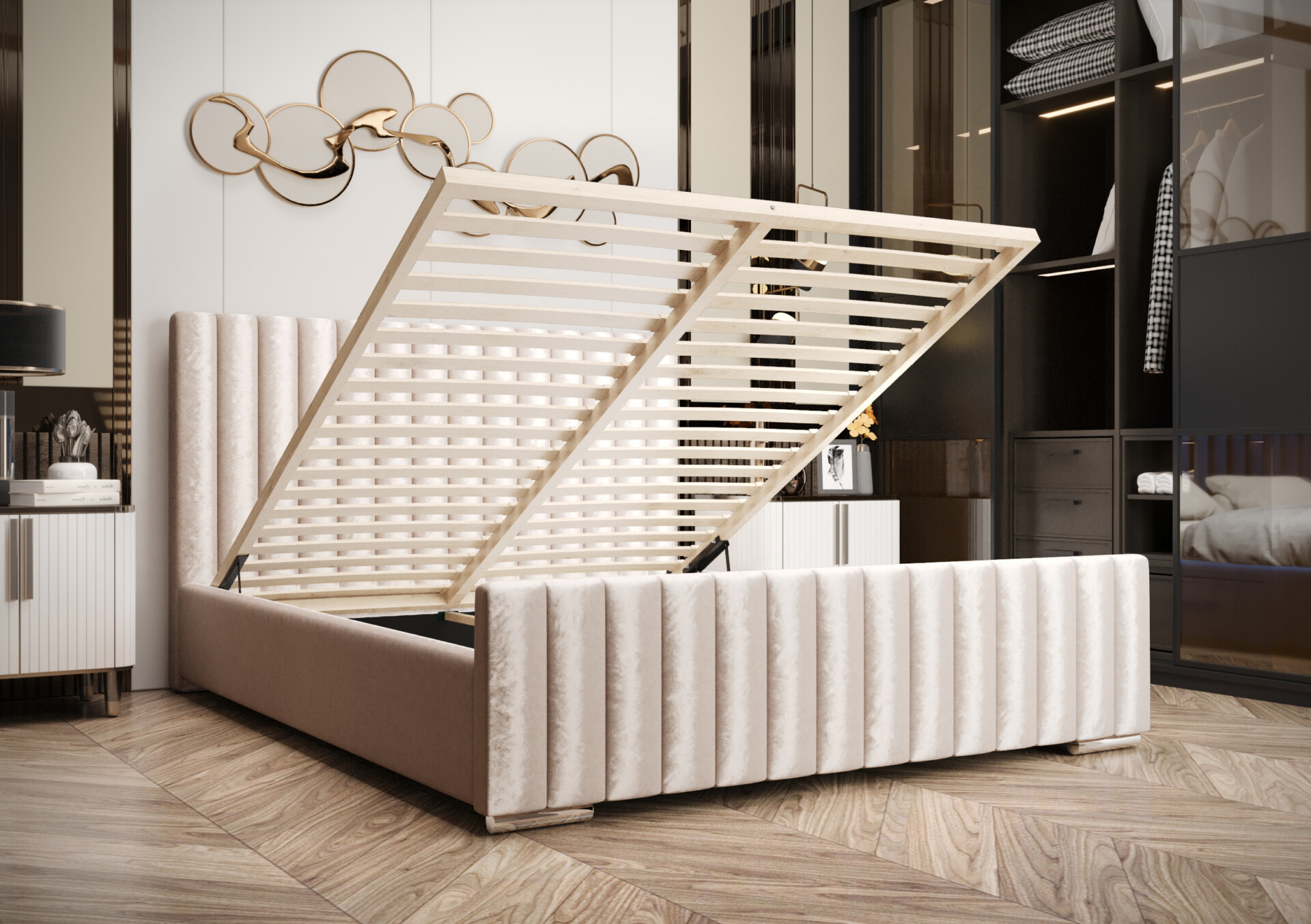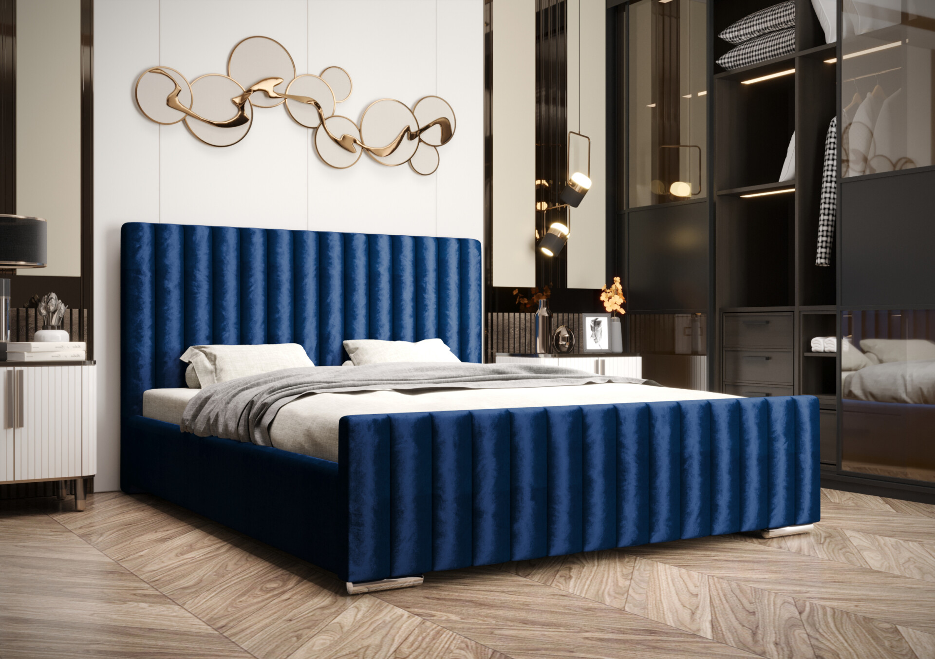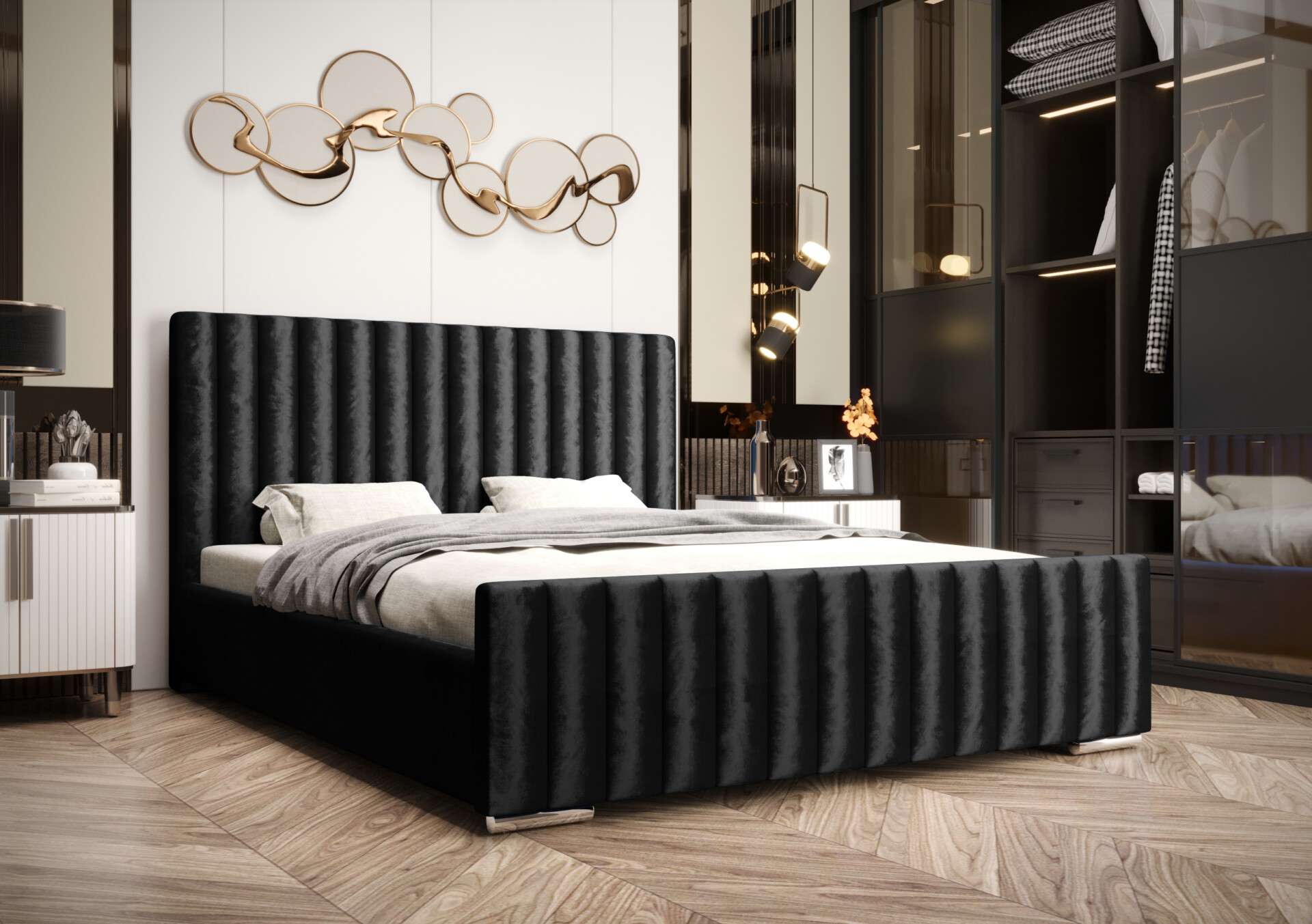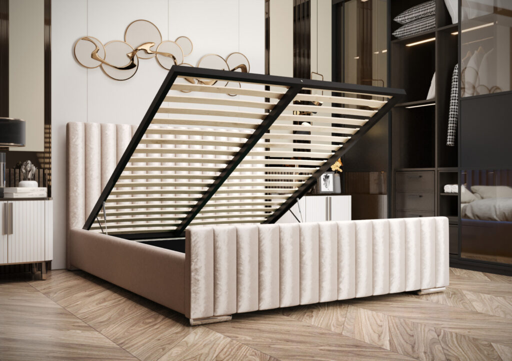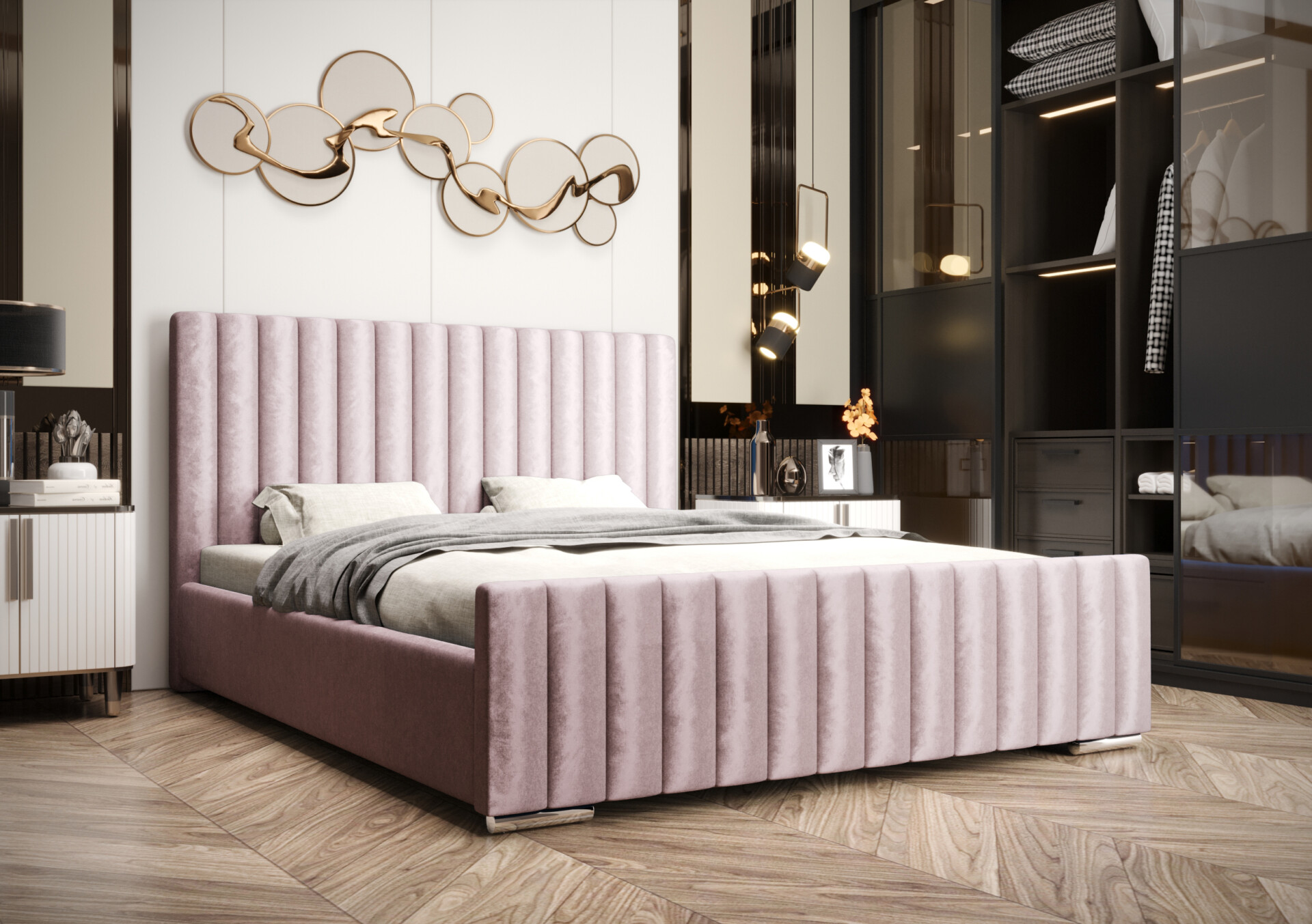 Konstrukcja łóżka została wykonana z solidnej płyty meblowej o grubości 30 mm, natomiast oparcie wzmocniono do 40 mm, co przekłada się na wyjątkową stabilność i trwałość. Tapicerowane wykończenie z ozdobnym, pionowym przeszyciem nadaje meblowi elegancki i nowoczesny charakter – wprowadza do sypialni subtelną nutę luksusu.