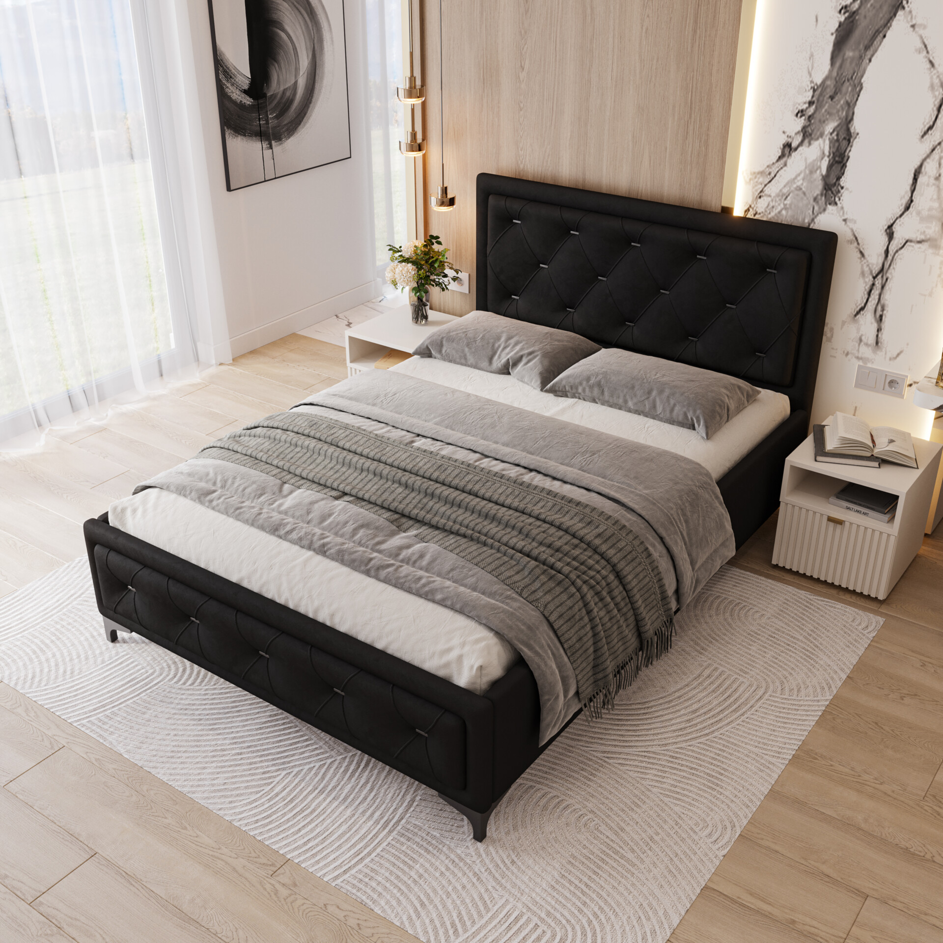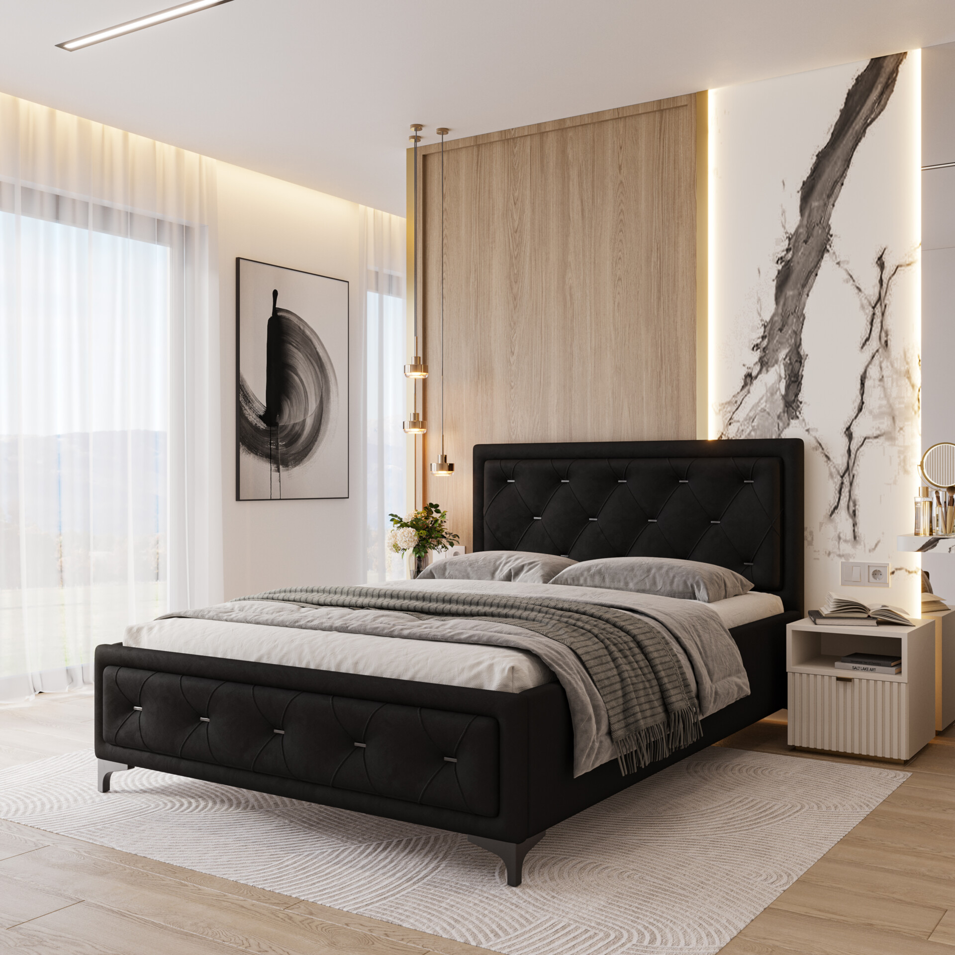 Łóżko tapicerowane Gaia – elegancki design, błyszczące pikowania i praktyczny pojemnik na pościel. Komfort, jakość i styl w Twojej sypialni.