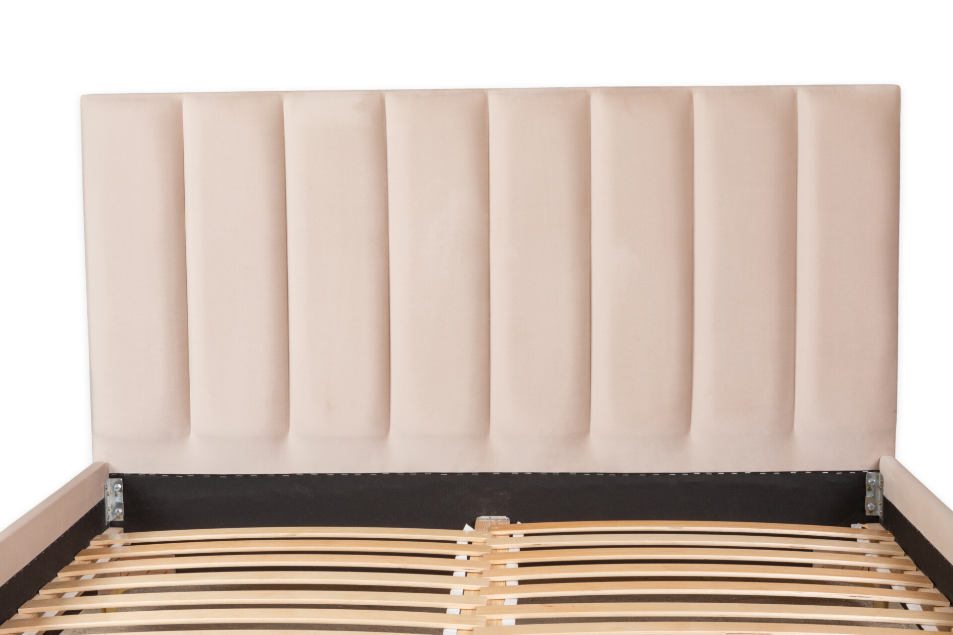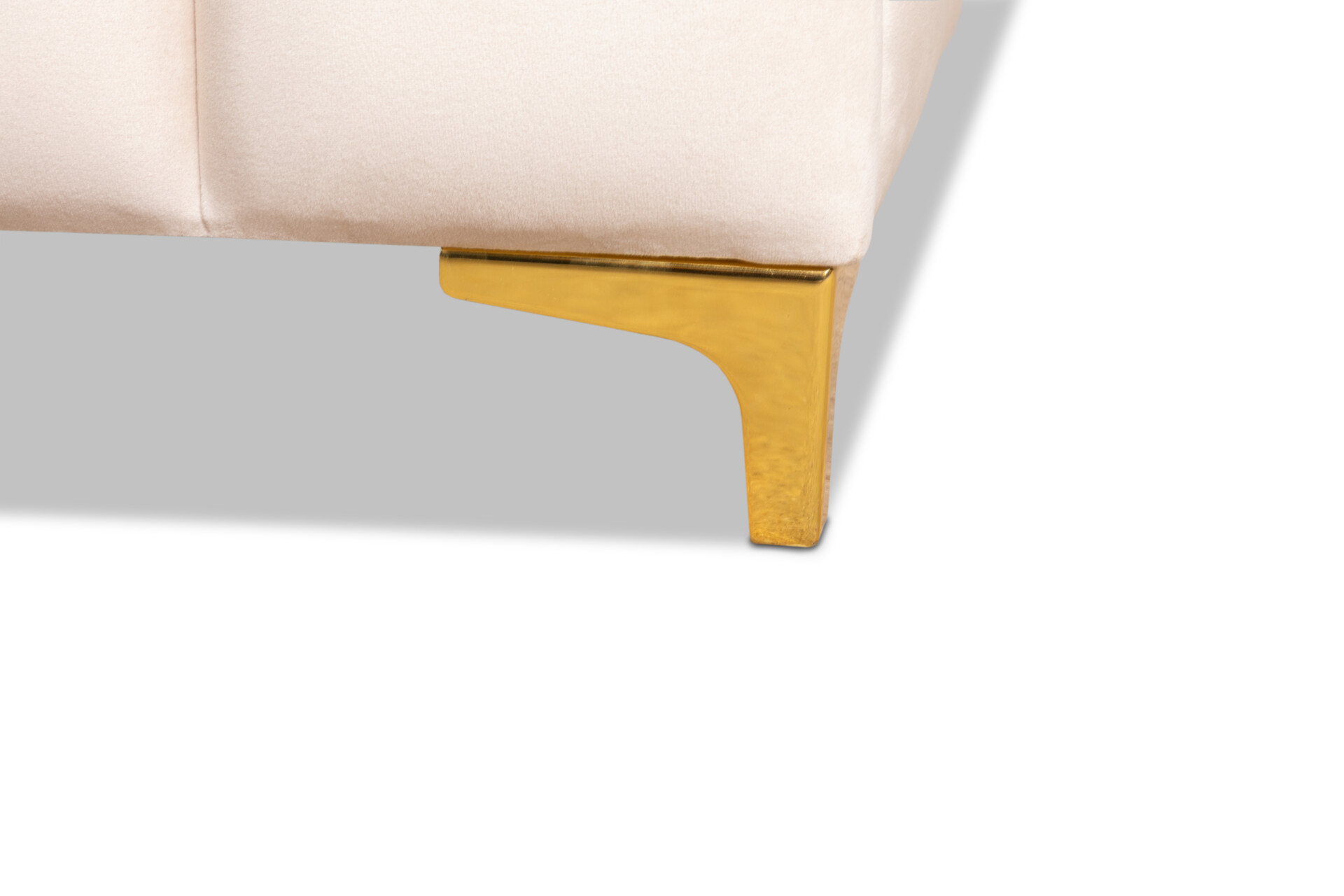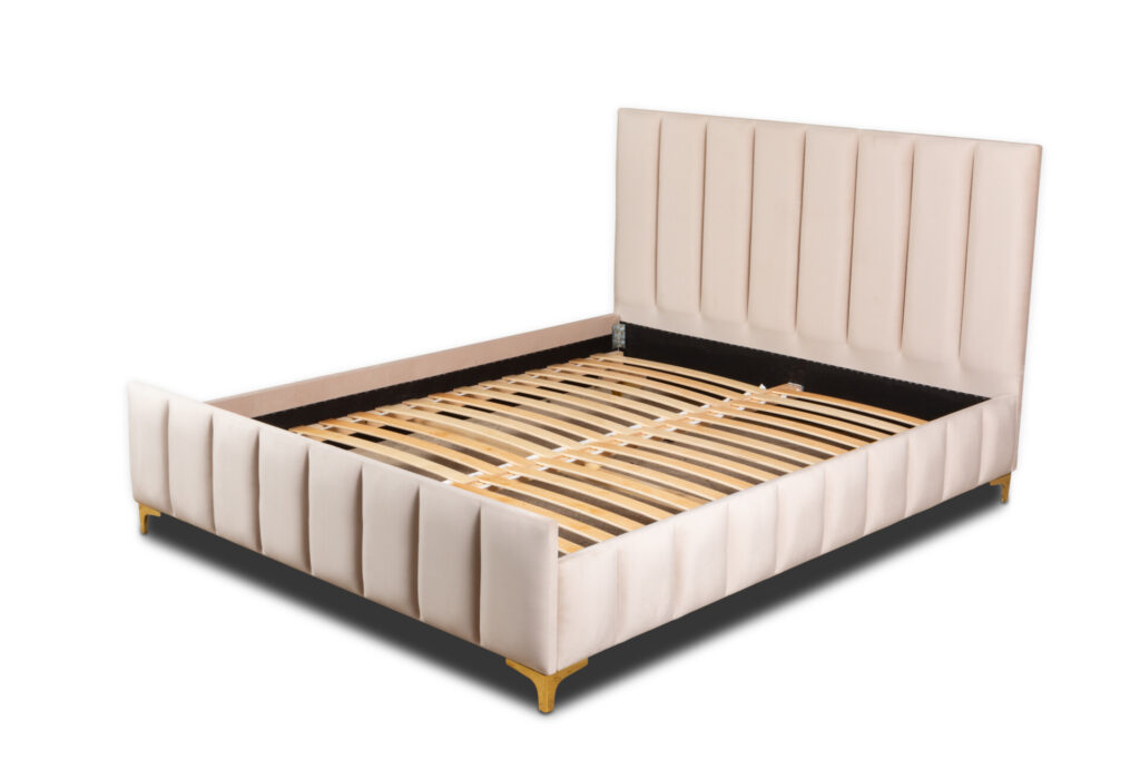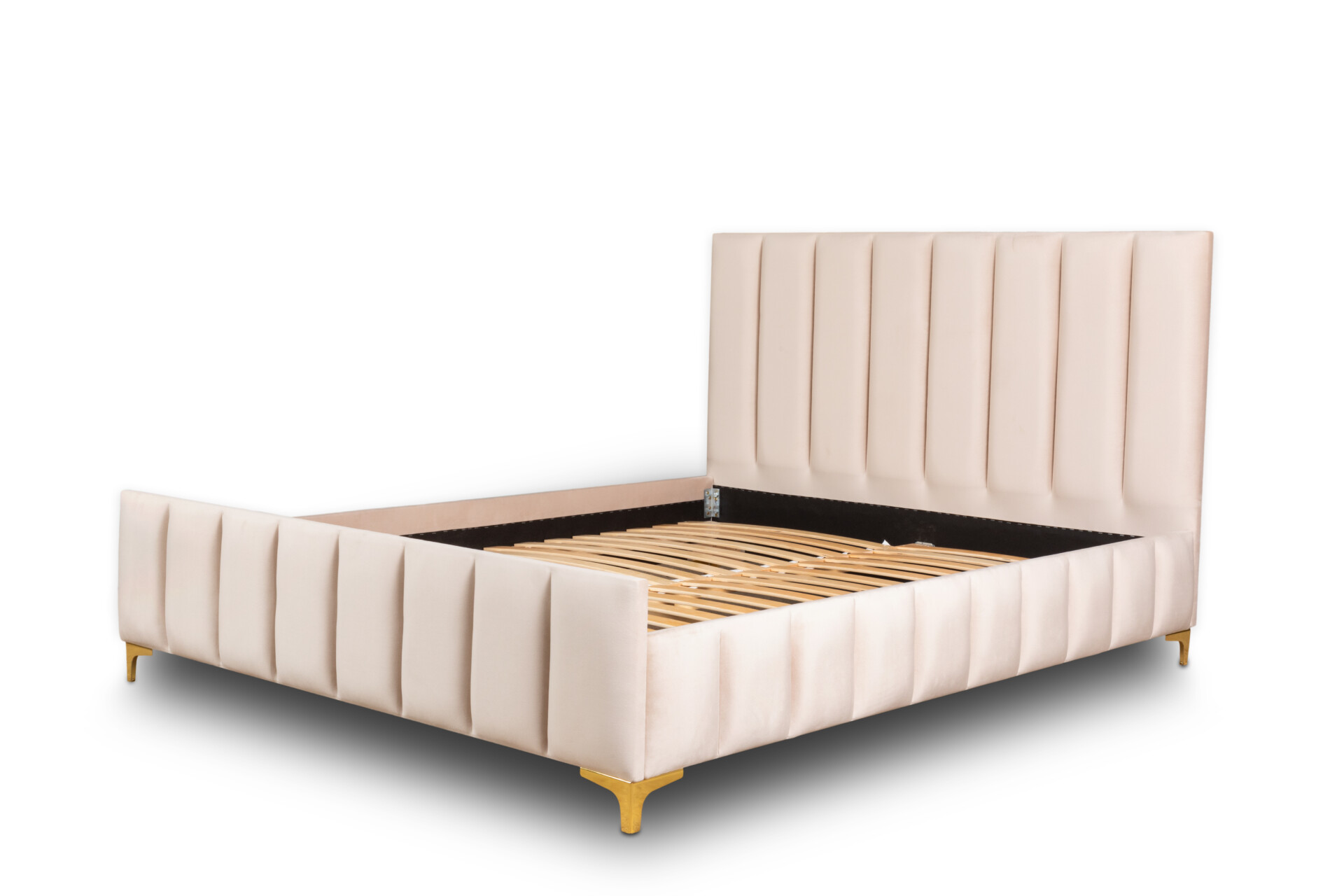 Łóżko Gusto osadzone jest na stabilnych, metalowych nóżkach w kolorze złotym, które dodają lekkości konstrukcji i wprowadzają nutę luksusu. W zestawie znajduje się drewniany stelaż z elastycznymi listwami sprężynującymi – element kluczowy dla zdrowego i komfortowego snu, idealnie współpracujący z materacem i dopasowujący się do pozycji ciała.