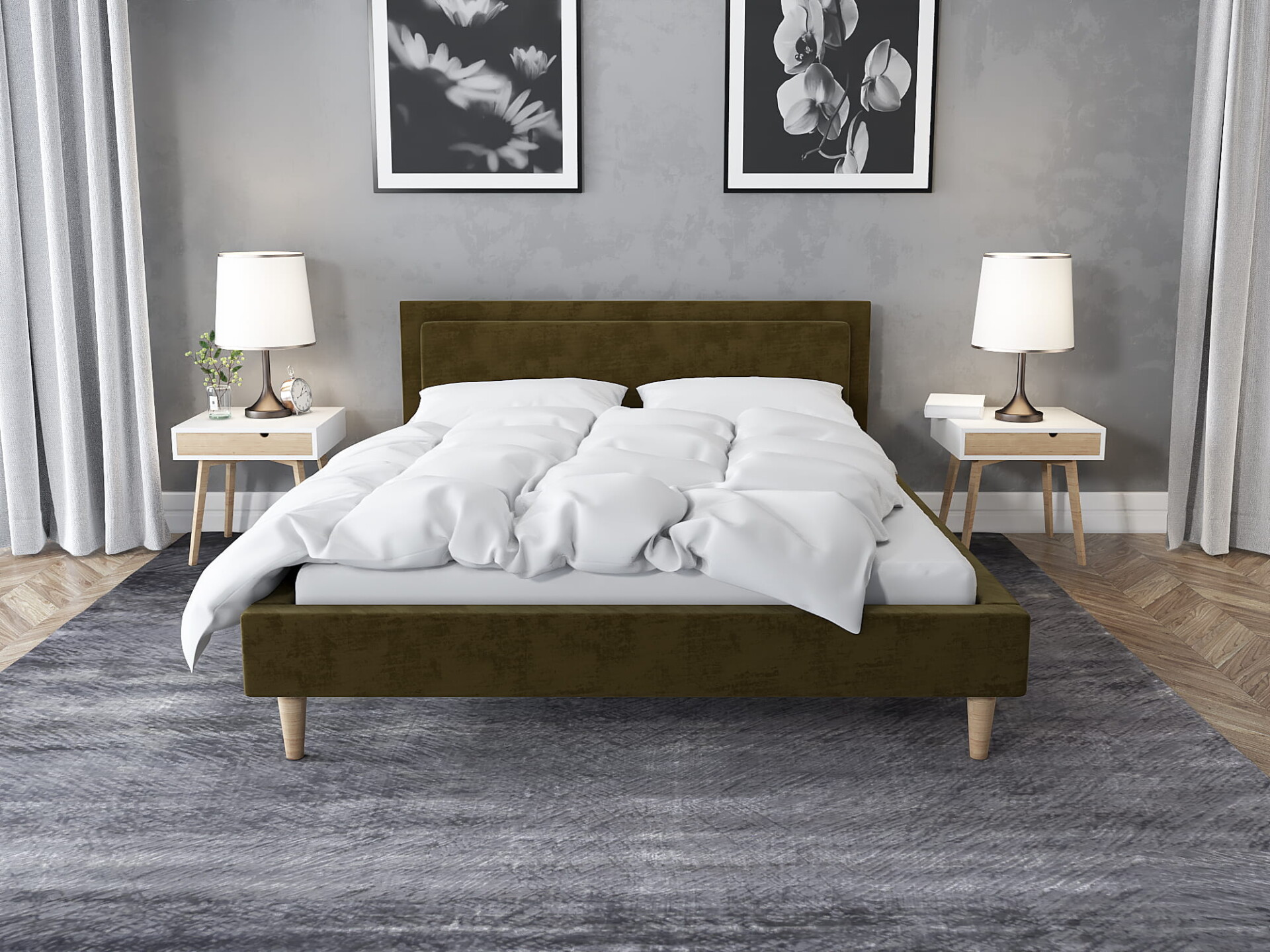 Smukłe, lekko zwężane nóżki z naturalnego drewna nadają bryle lekkości i optycznie powiększają przestrzeń sypialni. Solidna konstrukcja zapewnia stabilność i trwałość, a wysokiej jakości materiały gwarantują, że łóżko będzie służyć przez lata, zachowując swój nienaganny wygląd. Dzięki minimalistycznemu designowi mebel jest niezwykle uniwersalny – może stanowić zarówno centralny punkt aranżacji, jak i subtelne dopełnienie reszty wystroju.