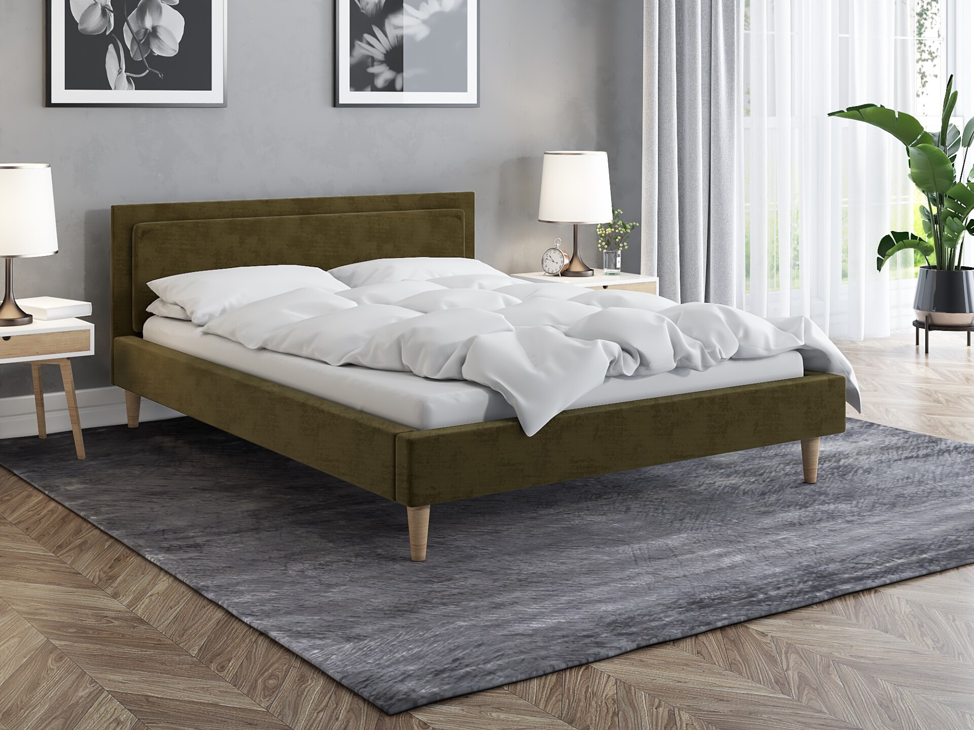 Łóżko tapicerowane Lumo to kwintesencja nowoczesnego minimalizmu połączonego z ponadczasową elegancją. Tapicerowane wysokiej jakości tkaniną w modnym, oliwkowym odcieniu, nadaje wnętrzu wyjątkowego charakteru i subtelnej klasy. Prosta linia konstrukcji sprawia, że łóżko doskonale wpasuje się zarówno w nowoczesne aranżacje, jak i w bardziej klasyczne wnętrza. Zagłowie zdobione delikatnym przeszyciem tworzy efekt subtelnej ramy, dodając całości elegancji bez nadmiernego przepychu.