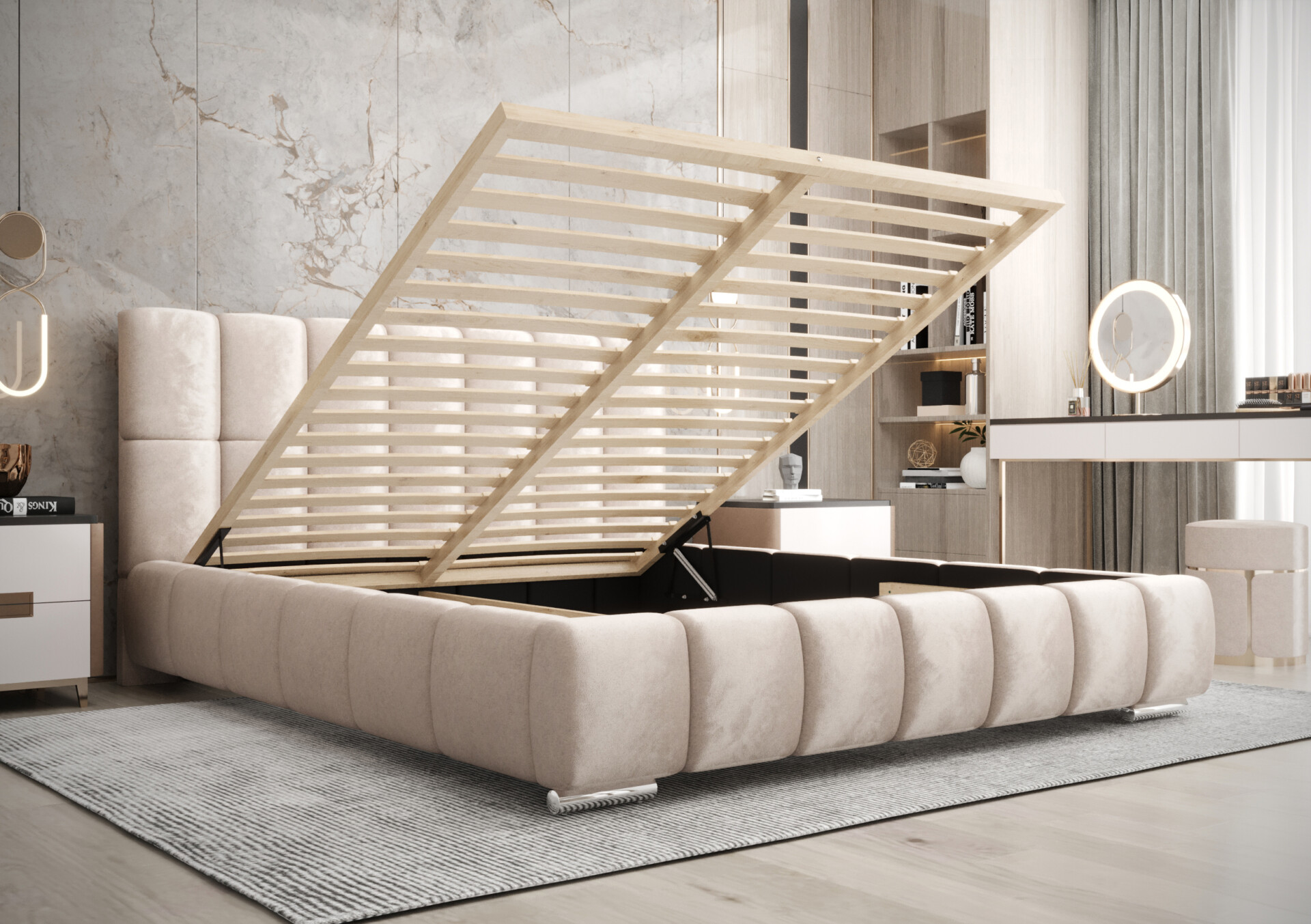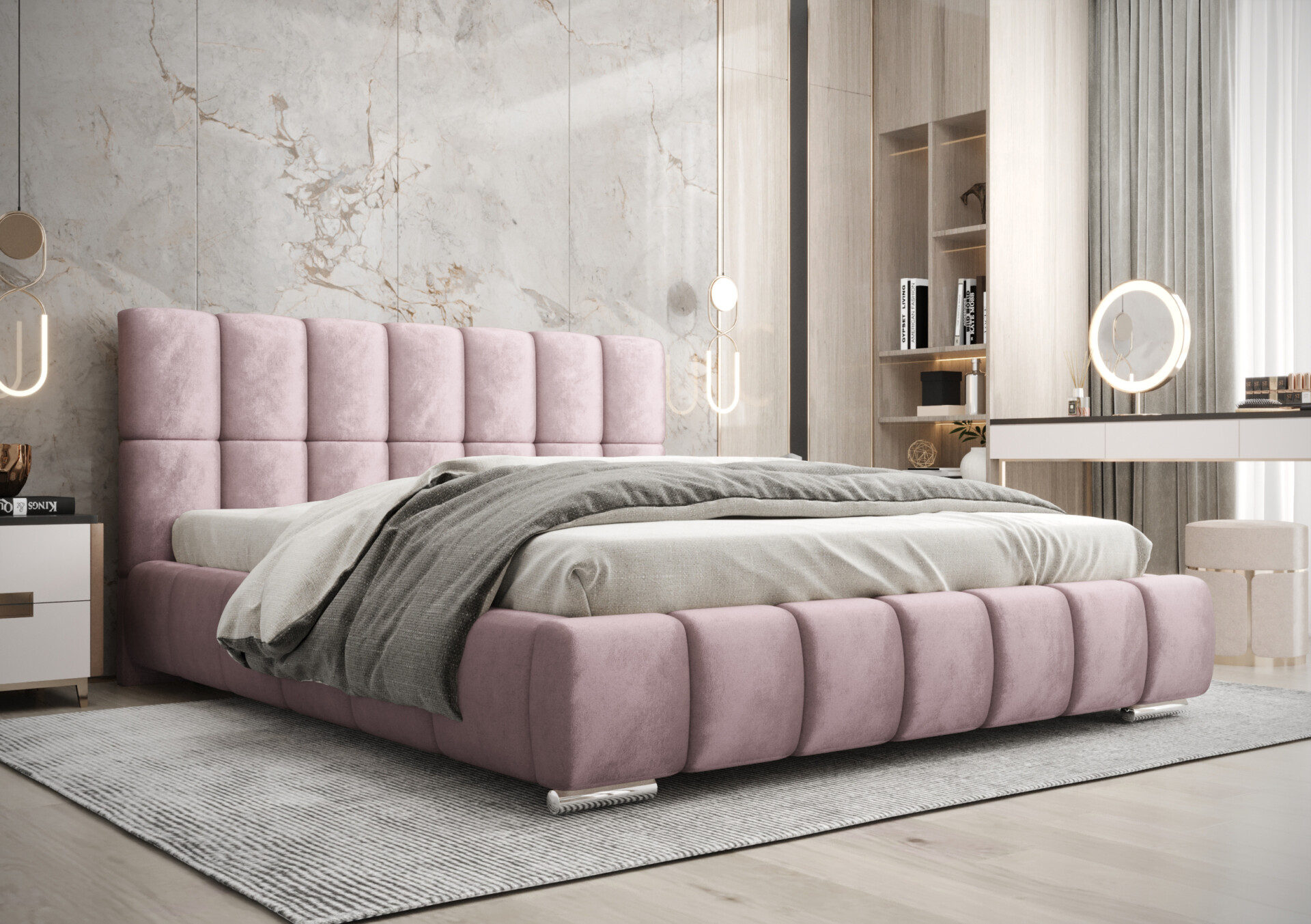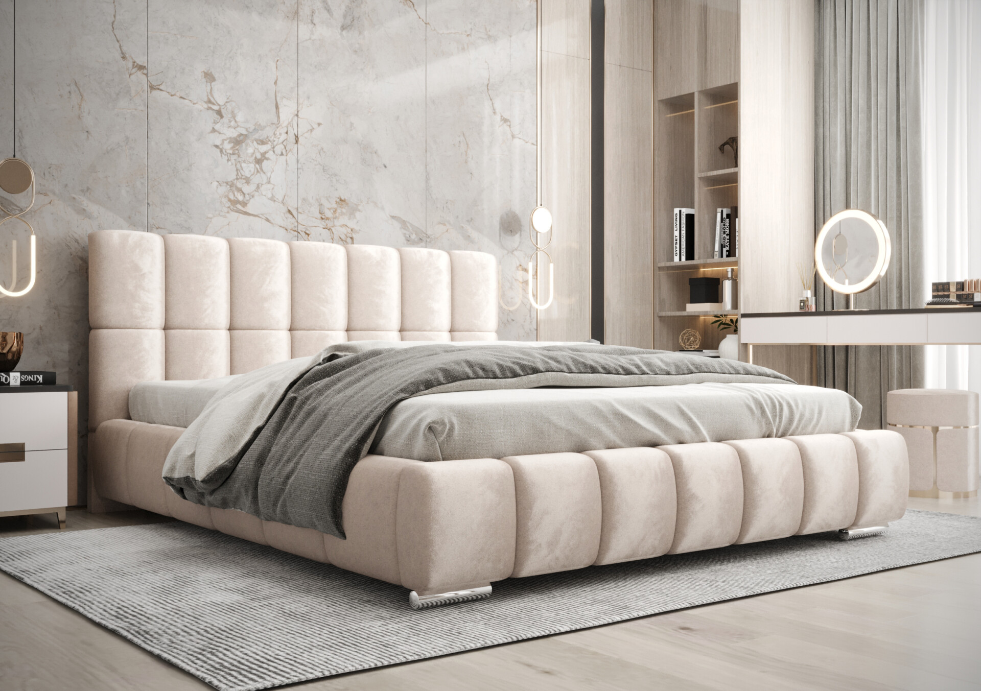 Zanurz się w luksusie dzięki łóżku Vedi, które łączy nowoczesną elegancję z najwyższym komfortem. Tapicerowane miękkim, welurowym materiałem, staje się centralnym punktem każdej sypialni – zarówno nowoczesnej, jak i klasycznej.