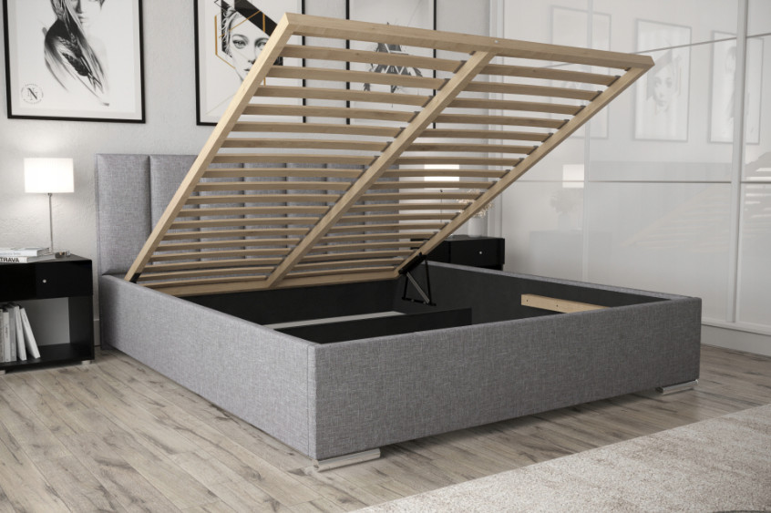Konstrukcja mebla została wykonana z grubej płyty meblowej (30 mm), a wzmocnione oparcie (40 mm) gwarantuje stabilność i trwałość przez długie lata. Dodatkowo łóżko wyposażono w praktyczny pojemnik na pościel wykonany z twardej płyty oraz mechanizm podnoszenia stelaża, który ułatwia codzienne użytkowanie.