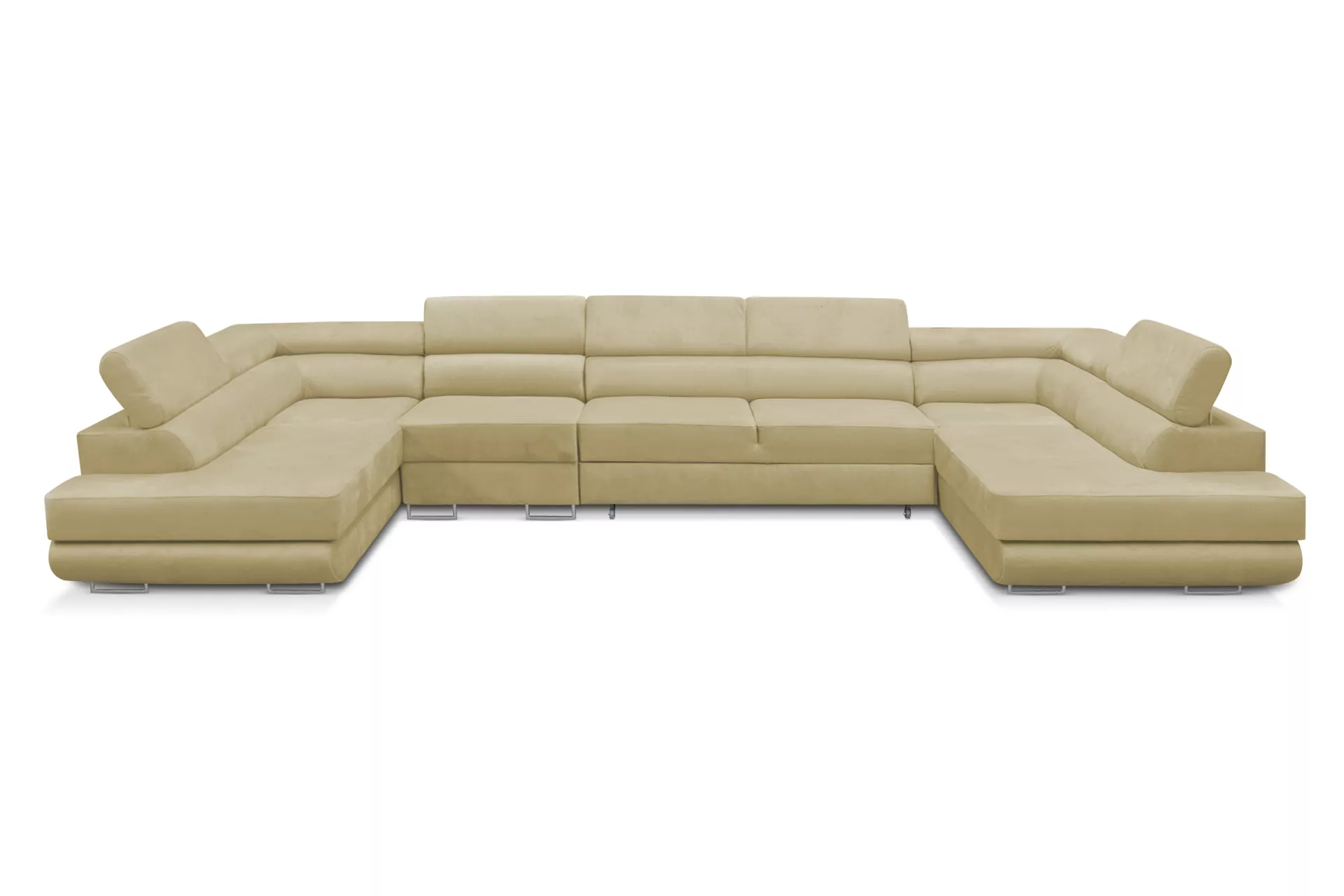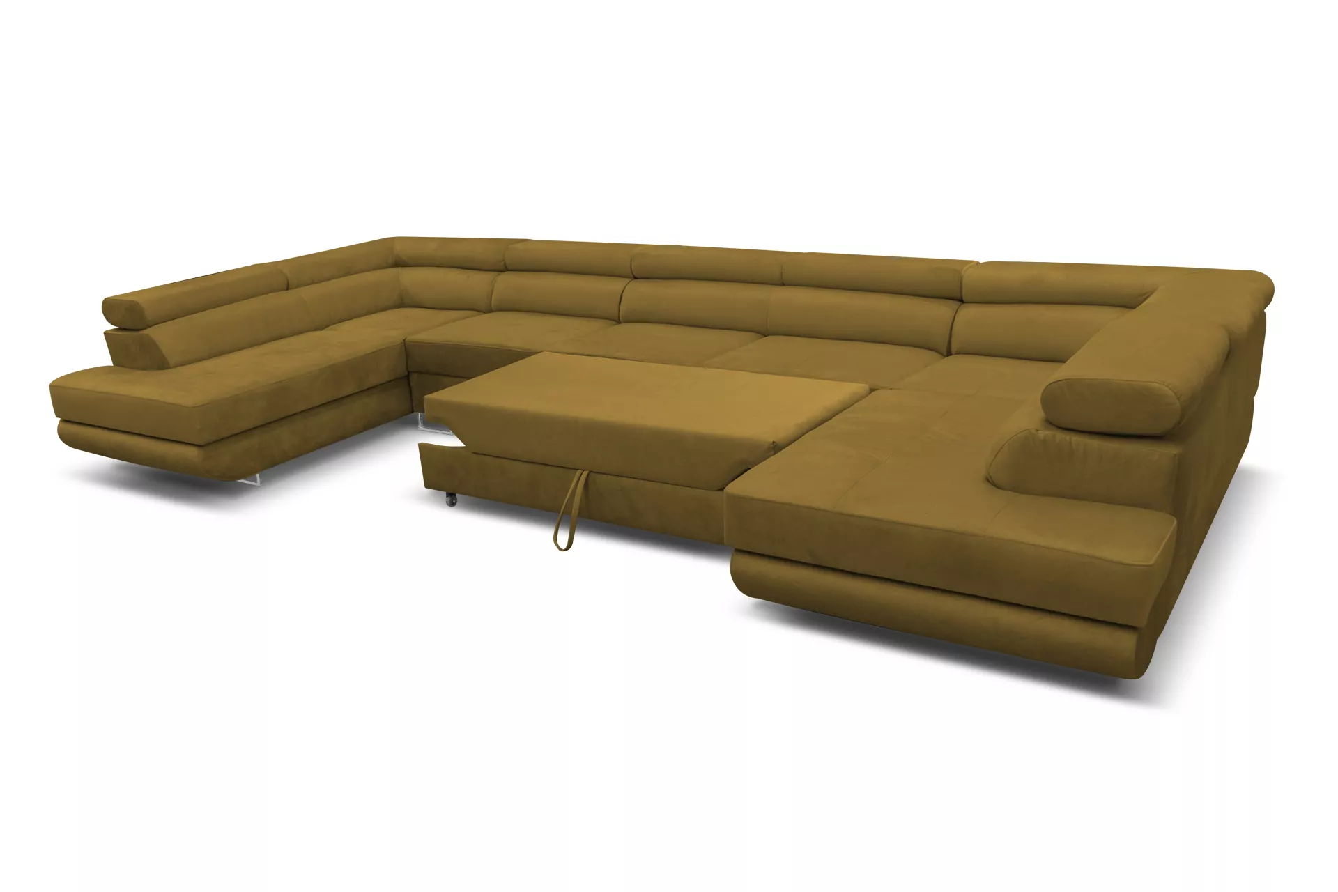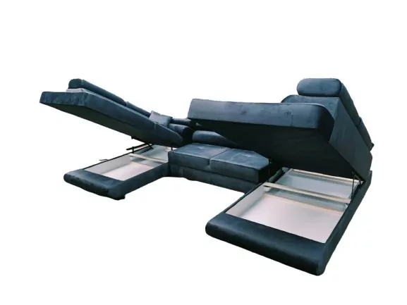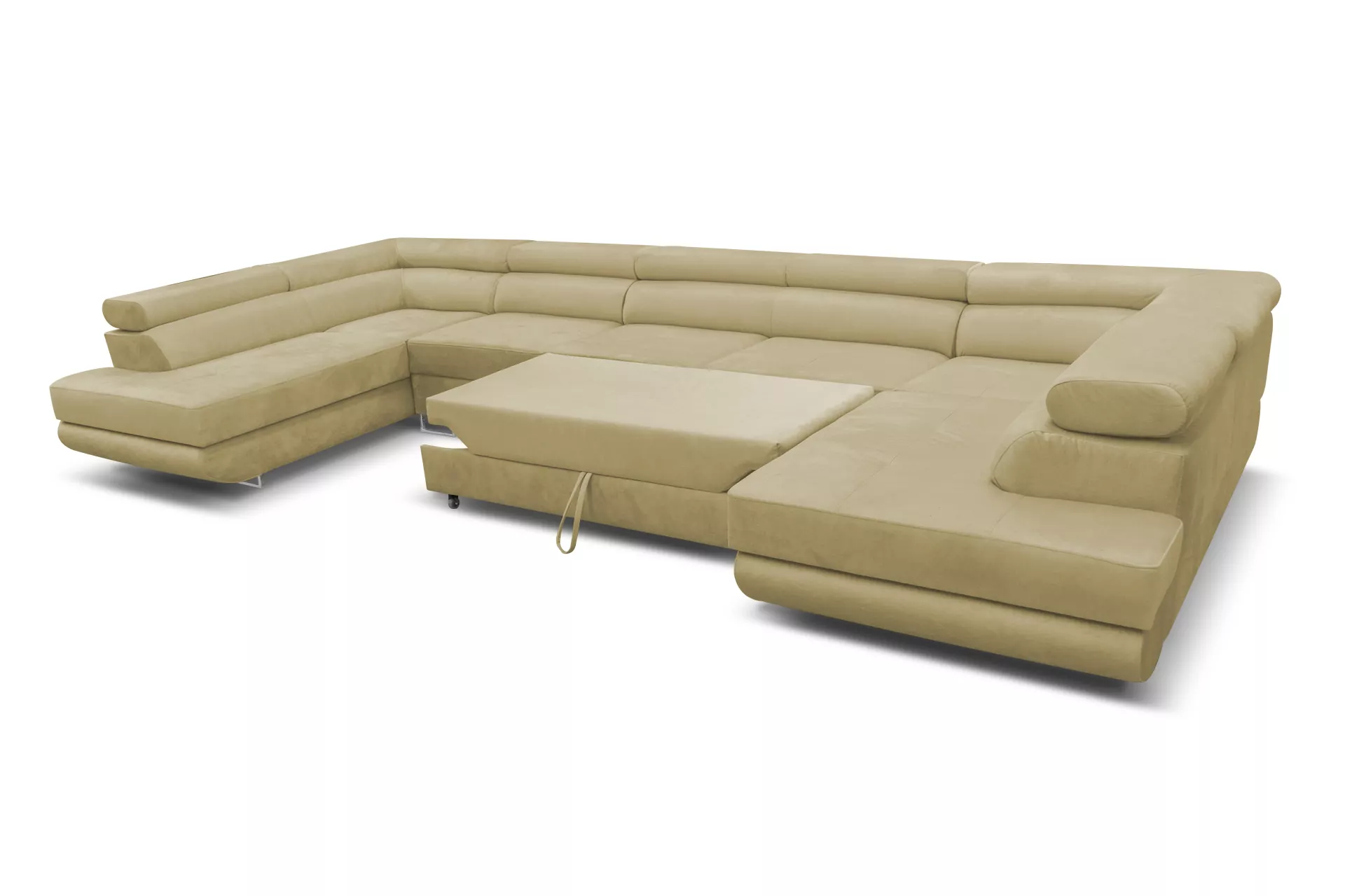 Narożnik Galaxy został wyposażony w funkcję spania, dzięki czemu w kilka chwil zamienia się w komfortowe łóżko. Powierzchnia spania: 250 × 125 cm – zapewnia wygodne miejsce dla dwóch osób. To doskonałe rozwiązanie, gdy odwiedzą Cię goście lub gdy chcesz cieszyć się dodatkową przestrzenią do odpoczynku. Dodatkowym atutem jest pojemnik na pościel, który ułatwia przechowywanie i pozwala utrzymać porządek w salonie.