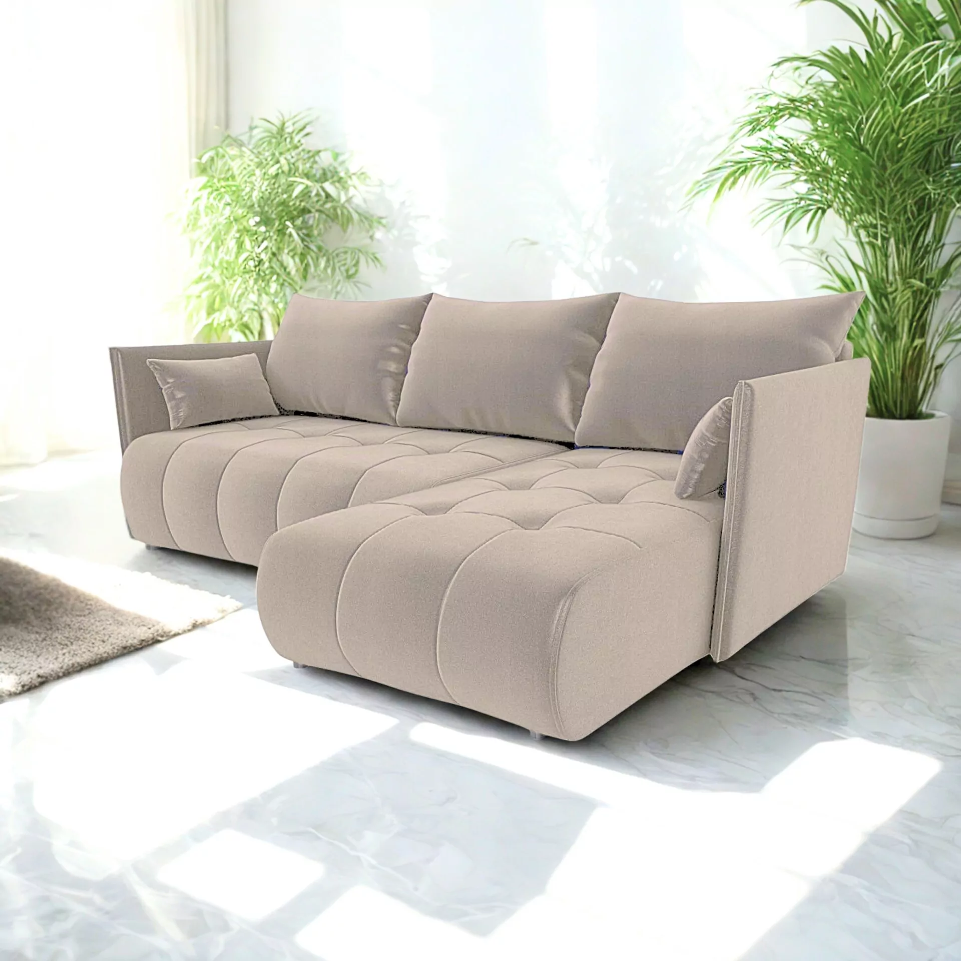 Prosta, nowoczesna bryła narożnika podkreślona została wysokiej jakości tapicerką o delikatnej, przyjemnej w dotyku strukturze. Tkanina nie tylko pięknie się prezentuje, ale także jest odporna na codzienne użytkowanie. Neutralna, elegancka kolorystyka pozwala dopasować narożnik Milano do różnych aranżacji – od wnętrz minimalistycznych i loftowych po bardziej klasyczne i przytulne przestrzenie.